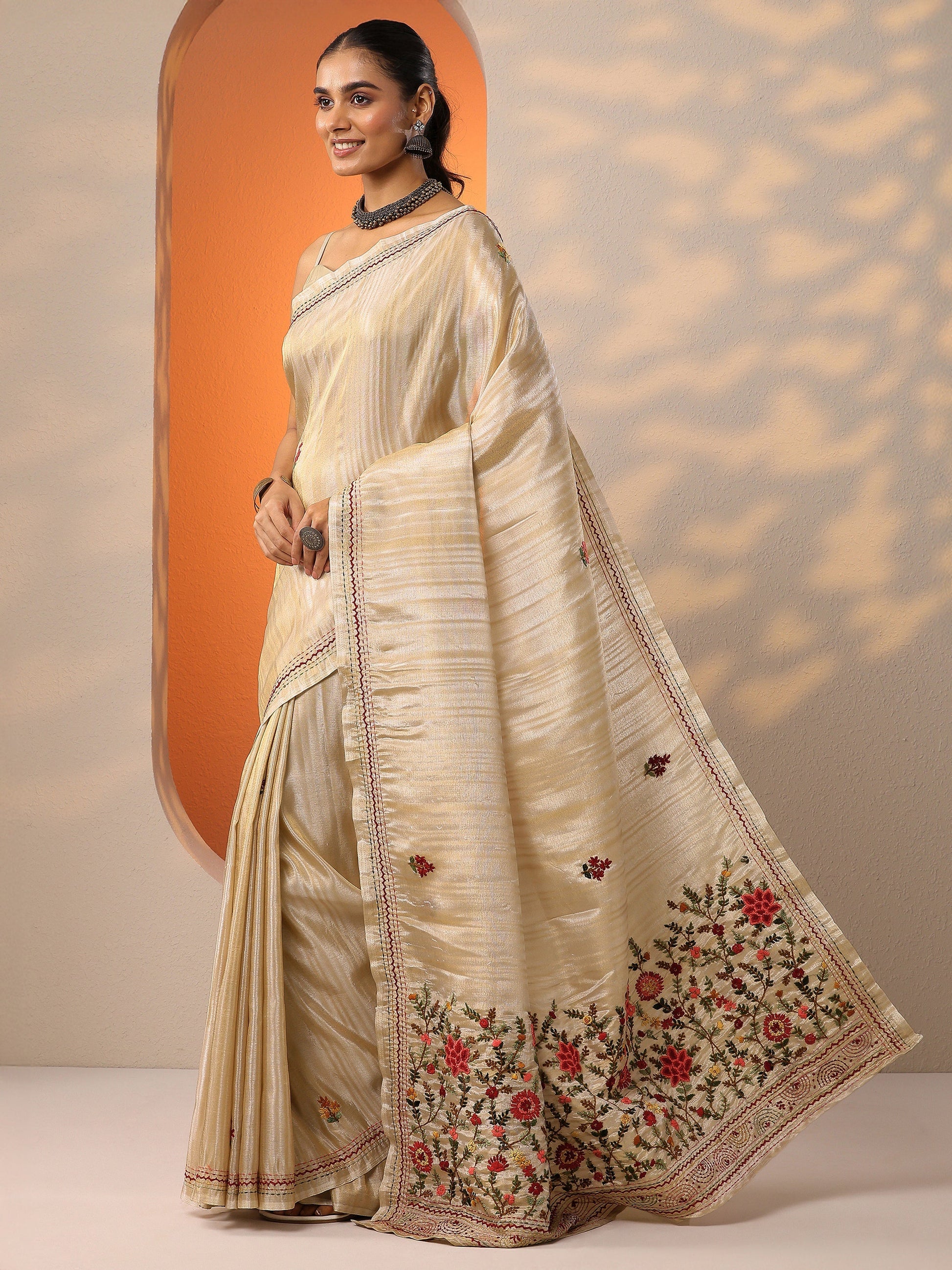 Beige Embroidered Silk Blend Saree With Unstitched Blouse Piece