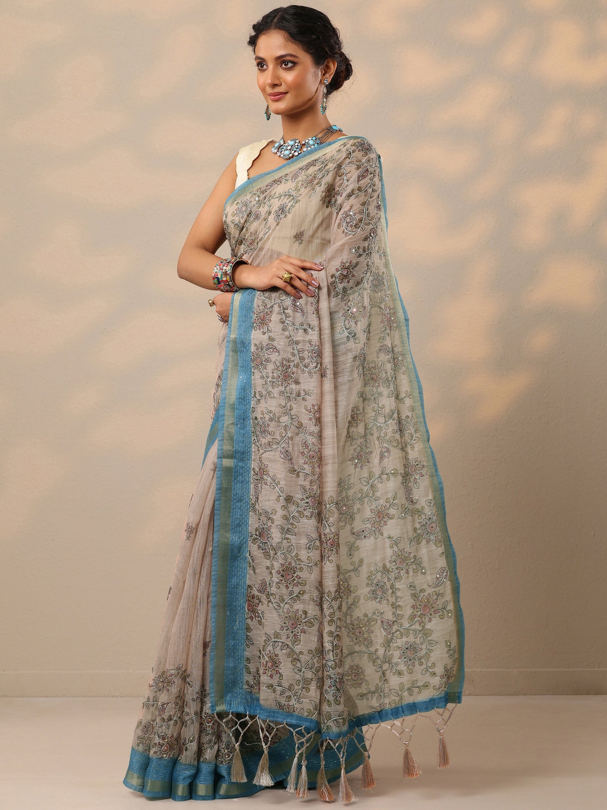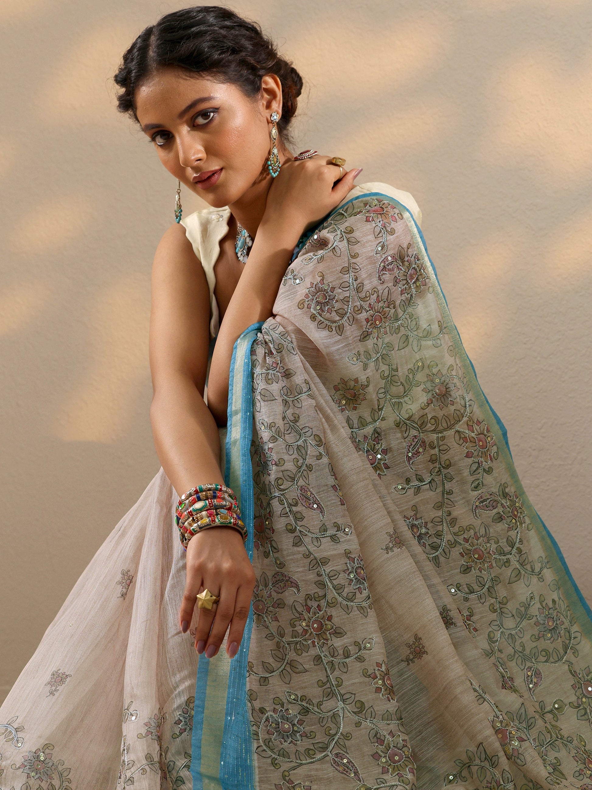 Our Beige printed cotton blend saree features captivating floral print. Complemented with a Blouse Piece. This charming saree is perfect for festive occasions.