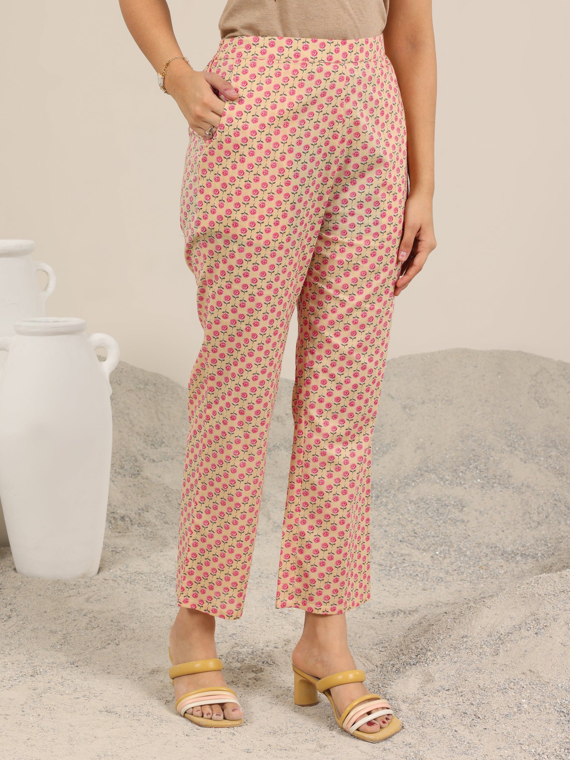 Our 2-piece beige cotton straight-fit features a notched neckline, regular sleeves, and statement yoke. Complemented with straight pants with a partially Partially Elasticated waistband and Roomy Pockets. Adorned with floral prints, this style is perfect for casual wear.