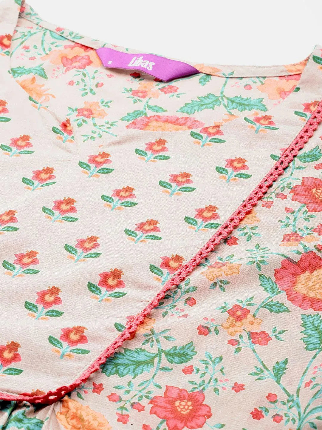 Our 2-piece beige printed cotton kurta set features a straight-fit kurta with a notched neckline and three-quarter sleeves. Complemented with Salwar pants with fully elasticated waistband. Adorned with captivating floral prints and lace accents, this style is perfect for casual outings.