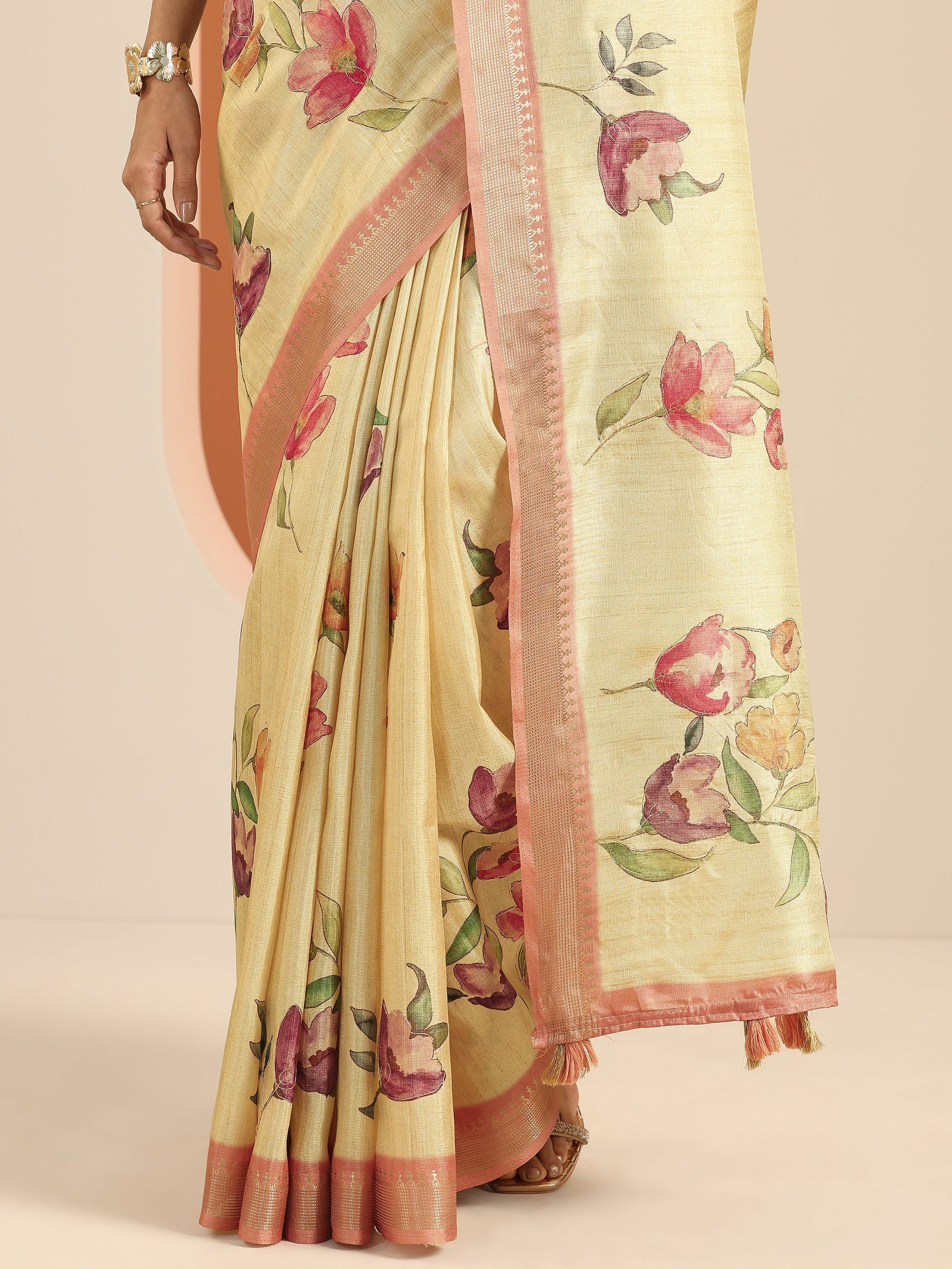 Our Beige Printed Silk Blend Saree Features Captivating Floral Printed Design. Complemented With A Unstitched Blouse Piece. This Charming Saree Is Perfect For Festive Wear.