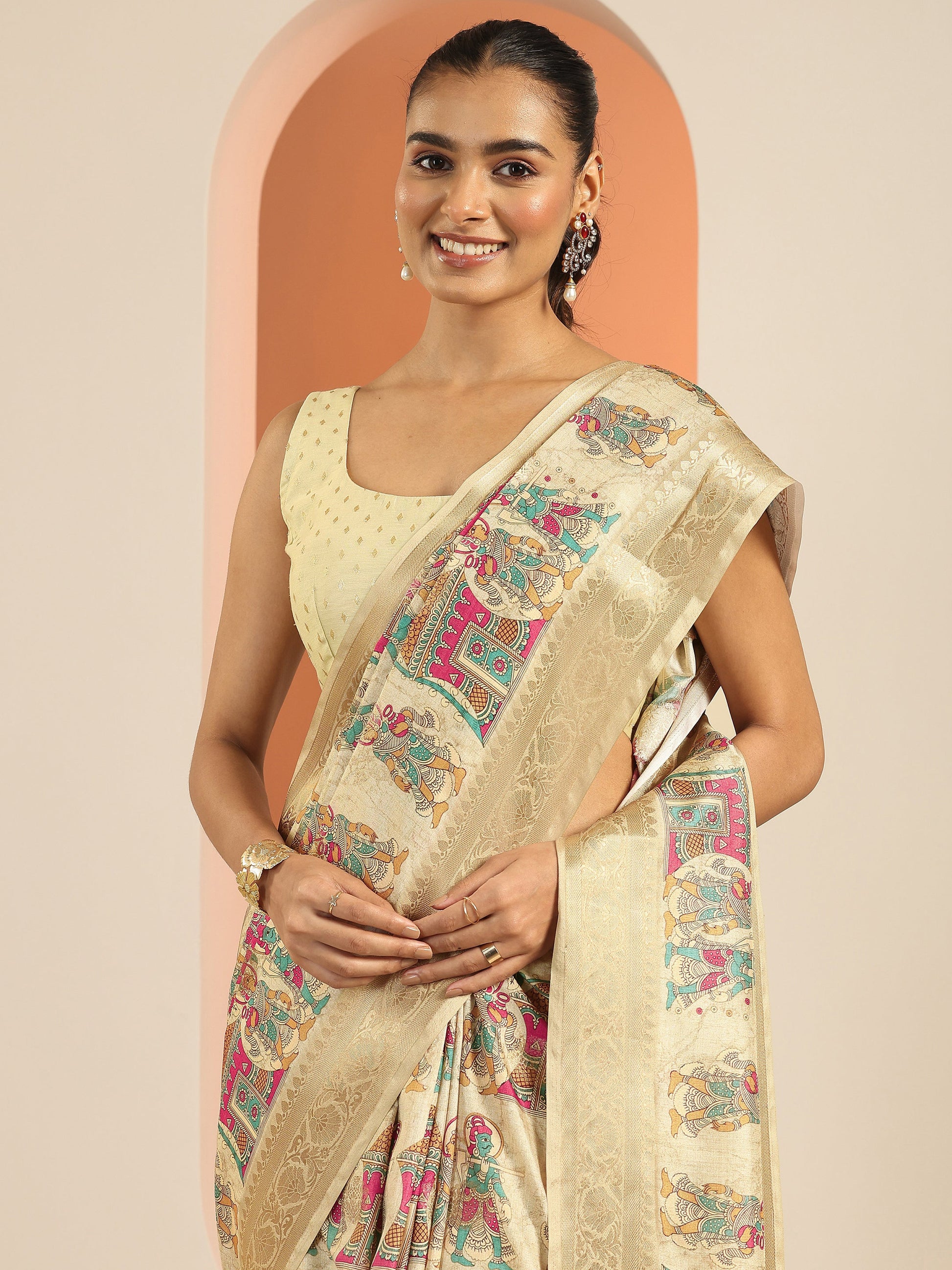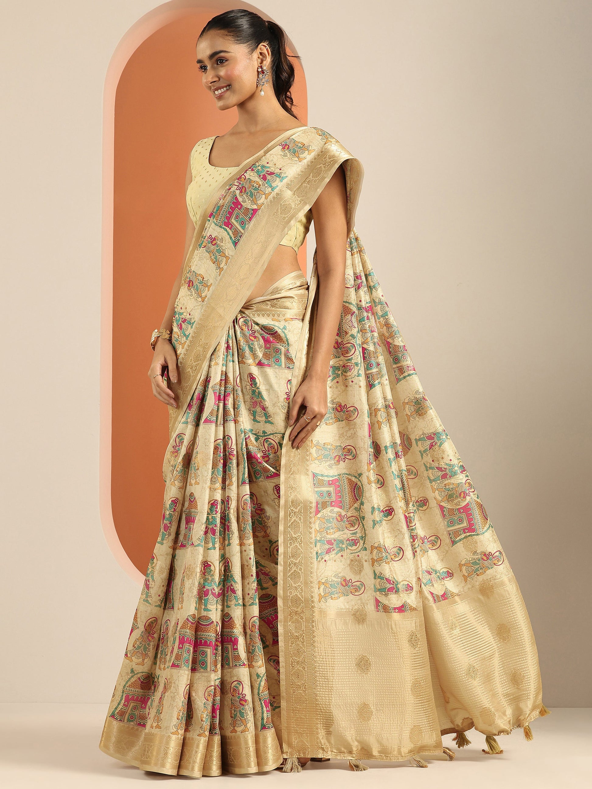 Our Beige Printed Silk Blend Saree Features Captivating Tribal Printed Design. Complemented With A Unstitched Blouse Piece. This Charming Saree Is Perfect For Festive Wear.