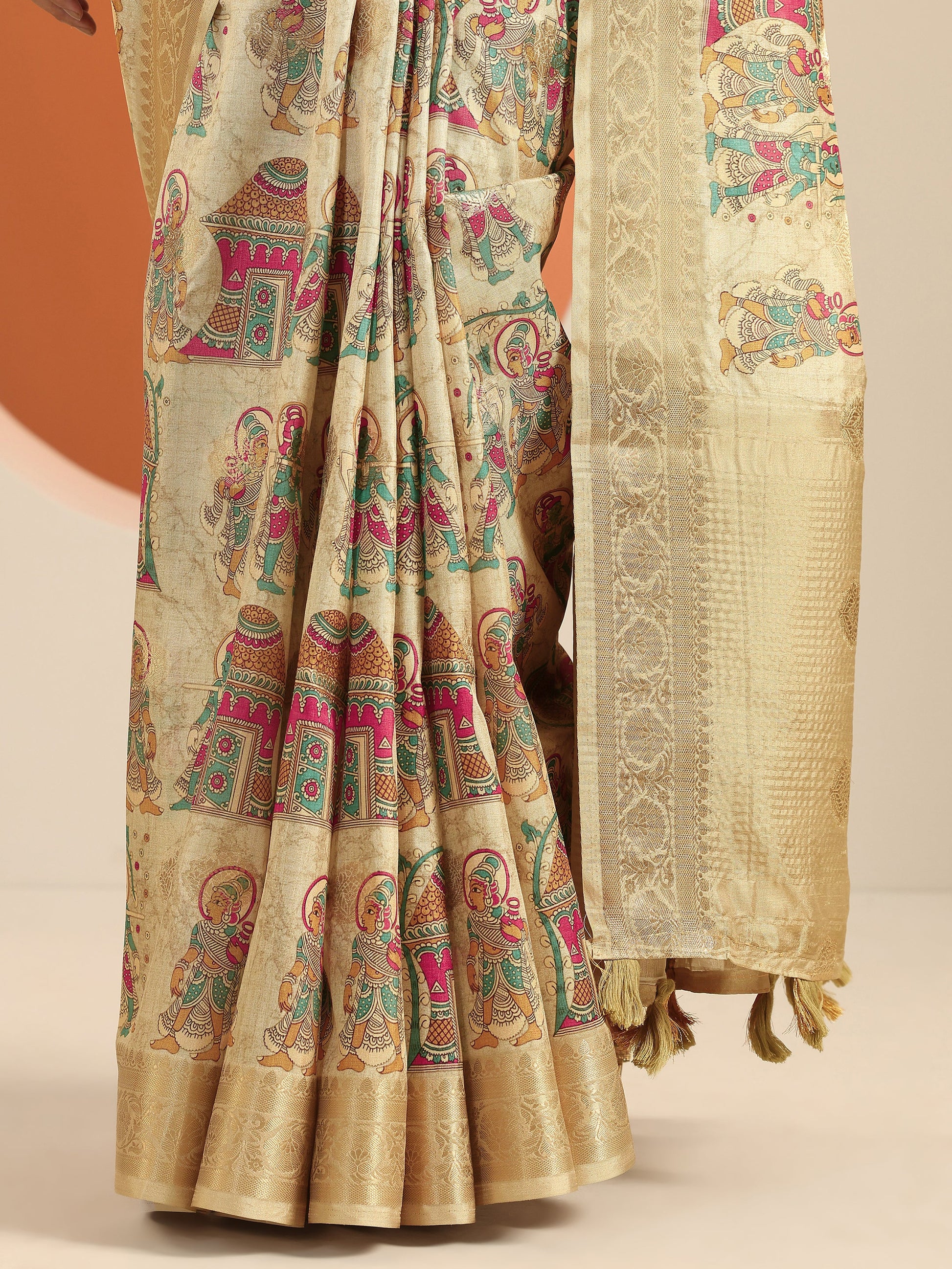 Beige Kalamkari Printed Silk Blend Saree With Unstitched Blouse Piece