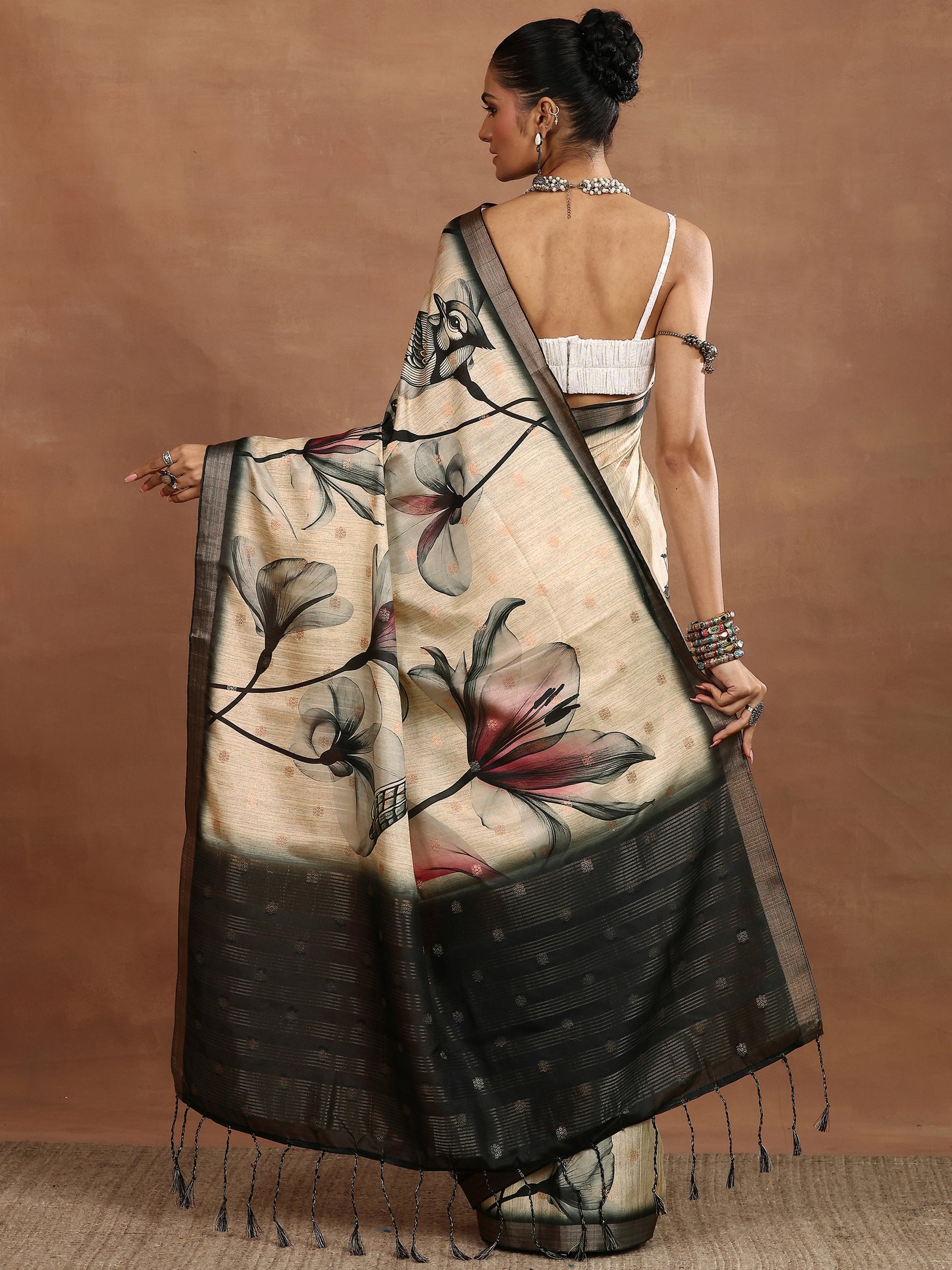 Beige Printed Silk Blend Sarees With Unstitched Blouse Piece