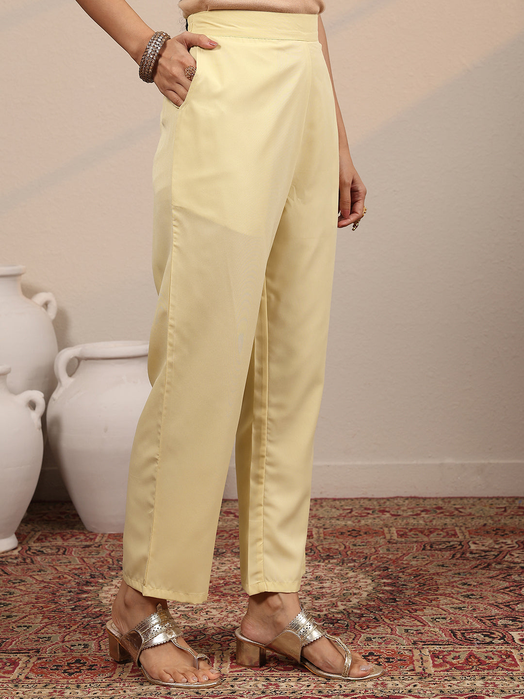 Our 3-piece beige silk blend straight-fit kurta set features a round neckline, regular sleeves, and a statement yoke. Complemented with lining and straight pants with a partially elasticated waistband, and a printed dupatta. Adorned with floral accents, this style is perfect for casual wear.