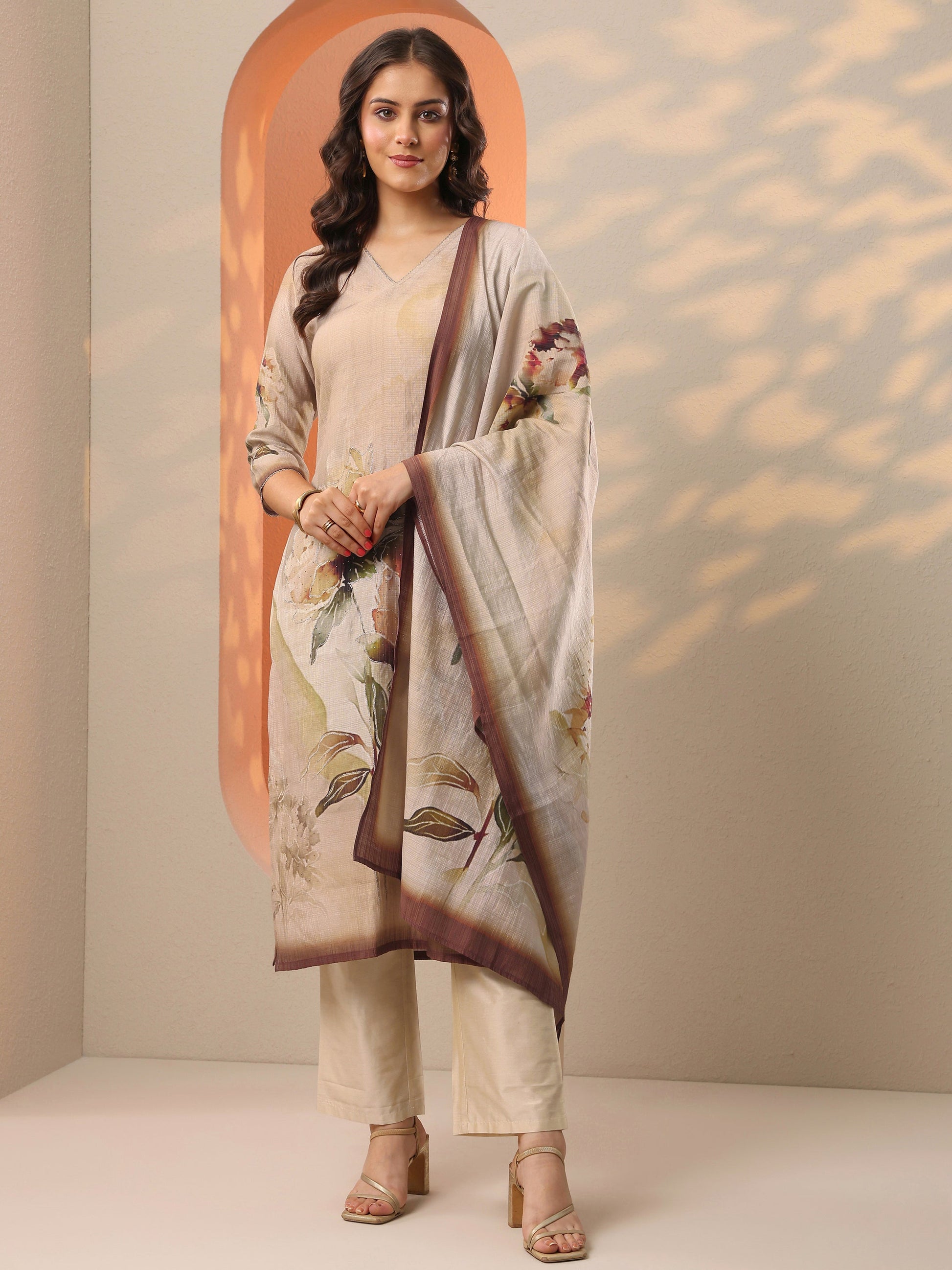 Beige Printed Silk Blend Straight Suit Set With Dupatta