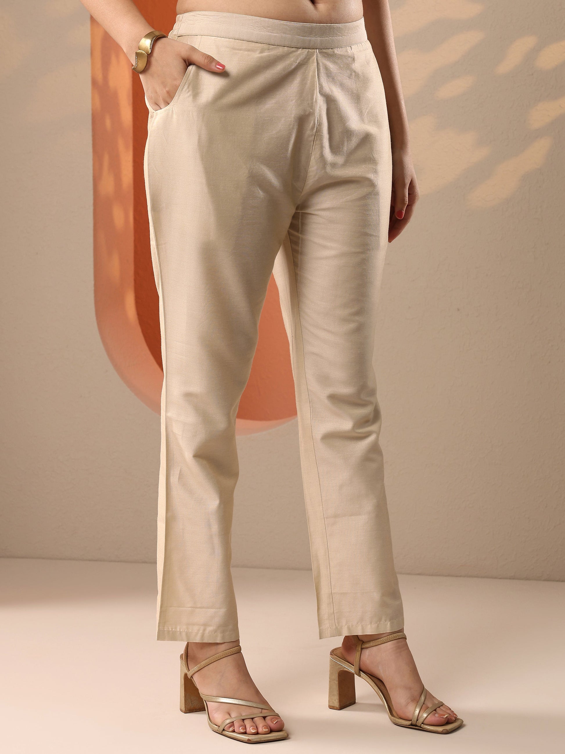 Our 3-piece beige silk blend straight-fit kurta set features a round neckline, regular sleeves, and statement yoke. Complemented with lining and straight pants with a partially elasticated waistband and 2 pockets, and a floral dupatta. Adorned with floral prints, this style is perfect for work wear and casual wear.