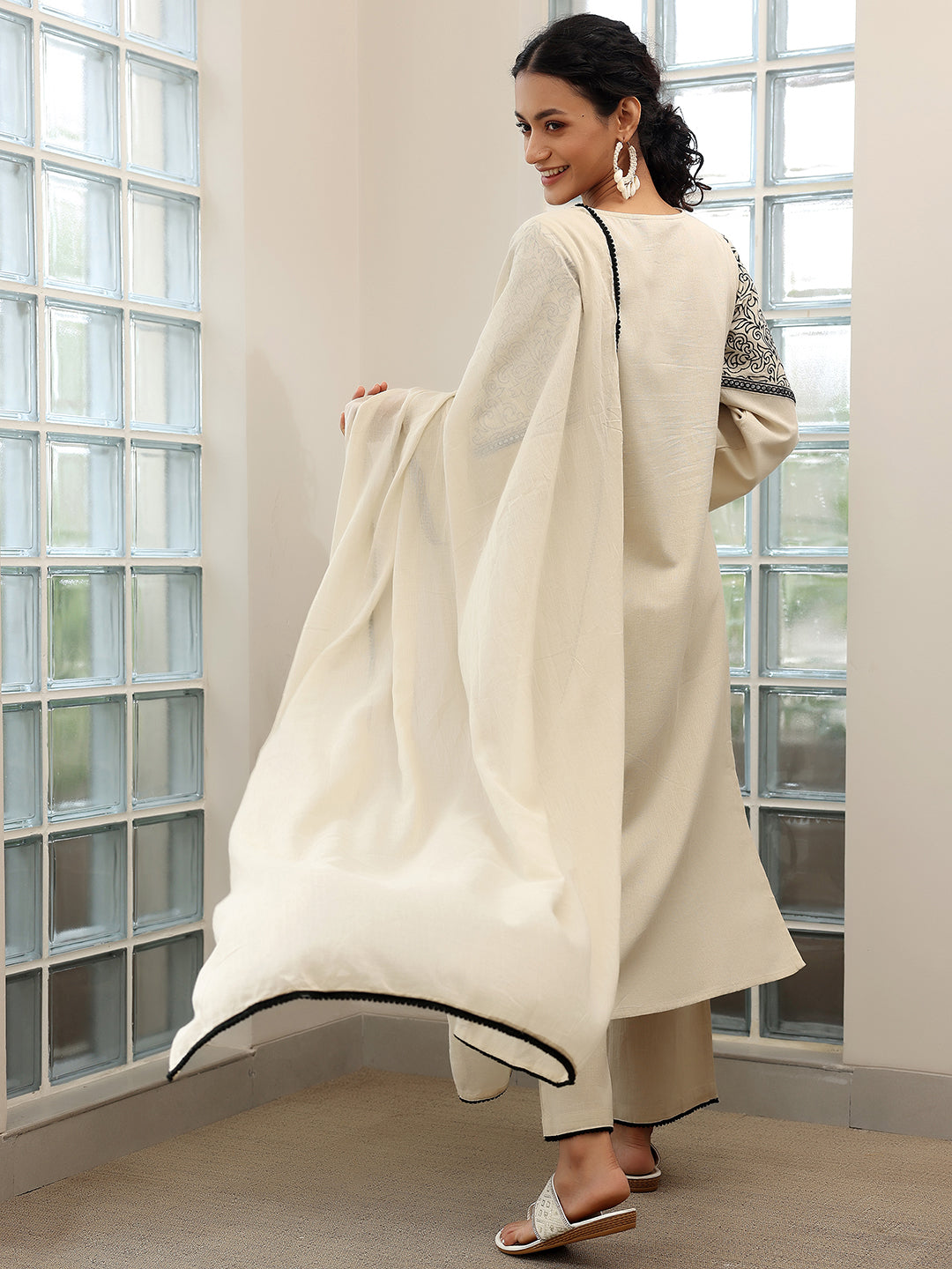 Our 3-piece Off White Cotton Blend Kurta Set features a Straight-fit kurta with a Round Neckline, Comfortable Full Sleeves, and statement yoke. Complemented with Straight Pants with an Elasticated waistband and a Solid dupatta. Adorned with Embroidered accents, this style is perfect for Semi Festive occasions.