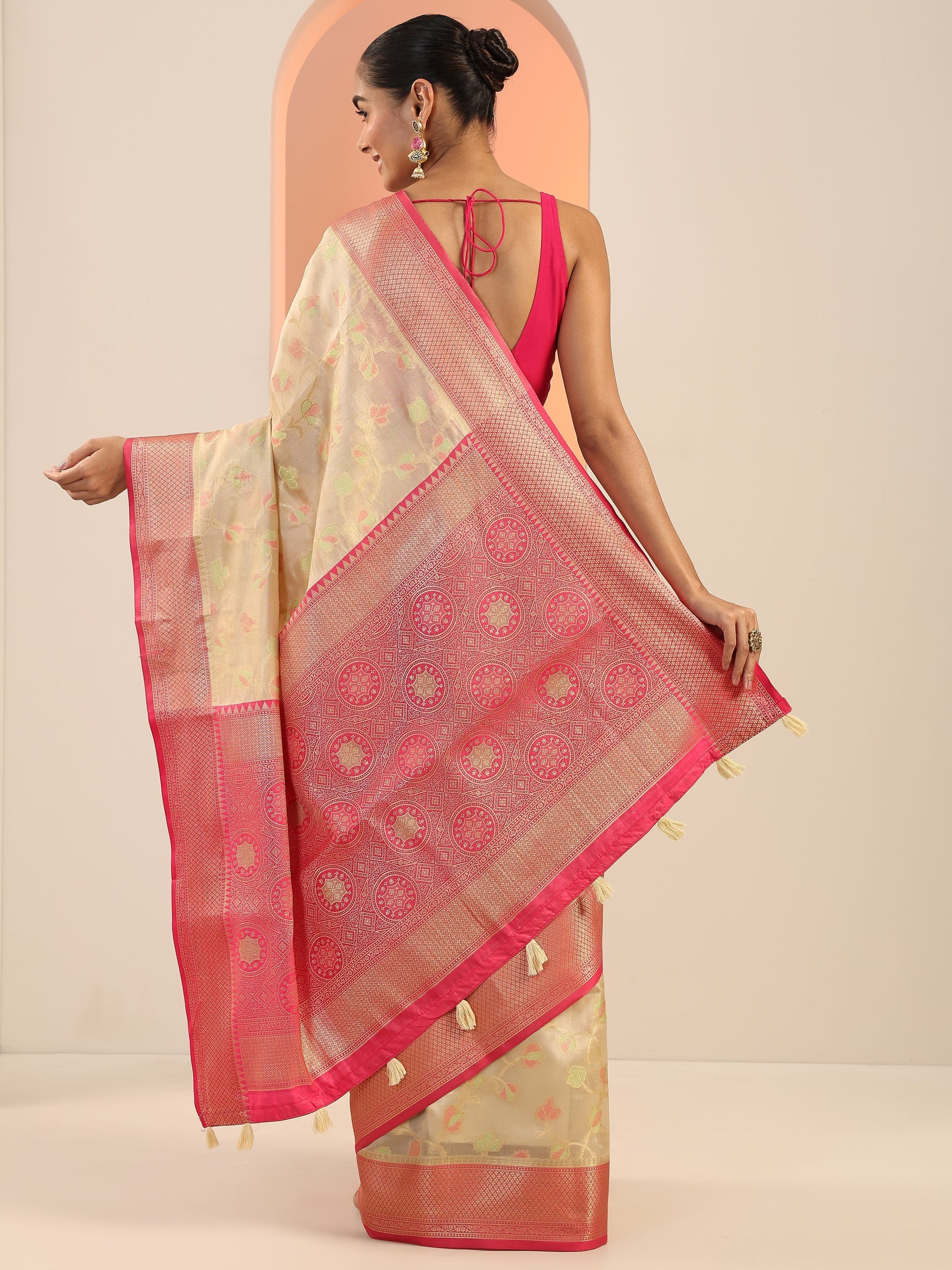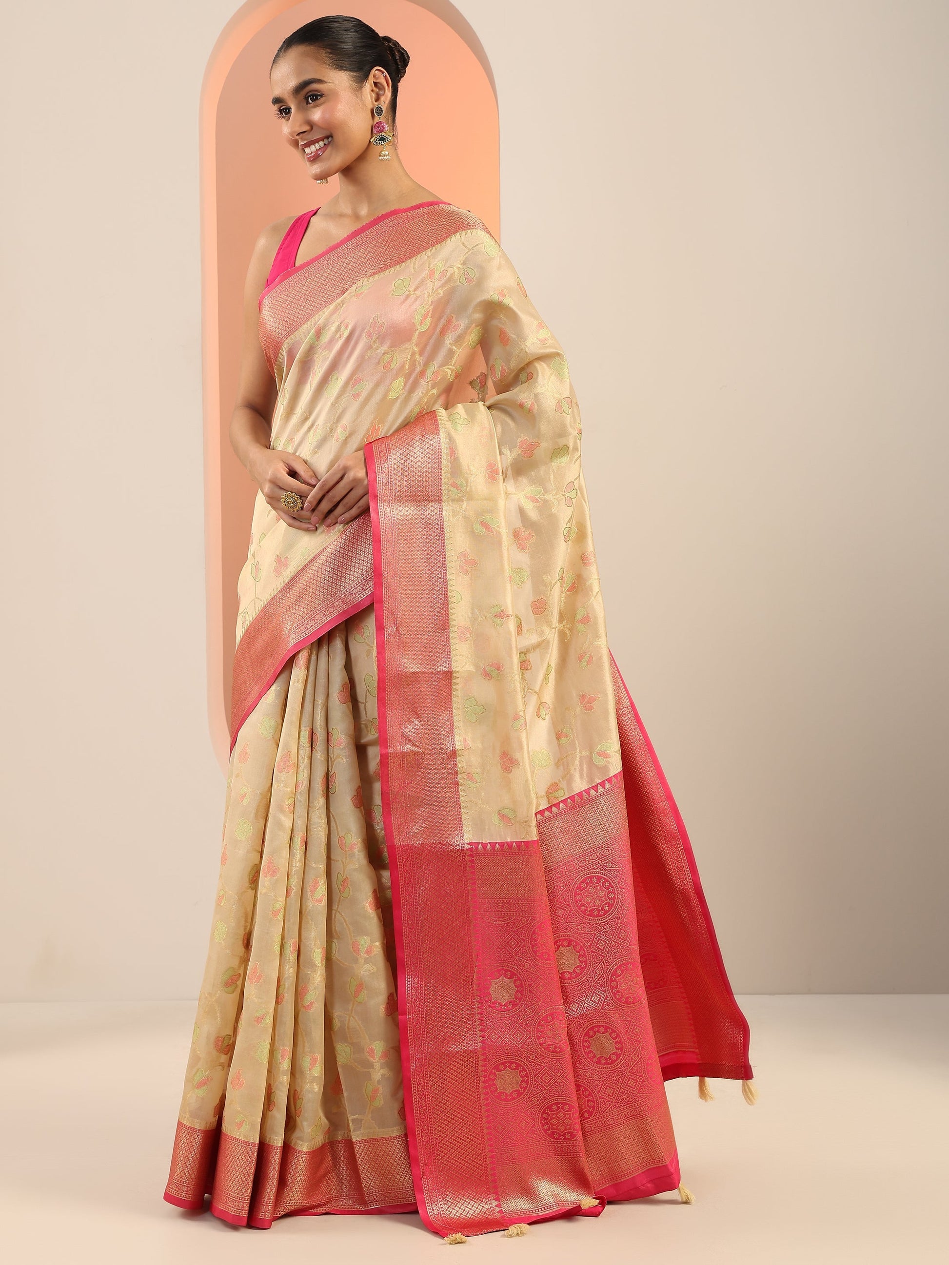 Beige Woven Design Banarasi Silk Saree With Unstitched Blouse Piece