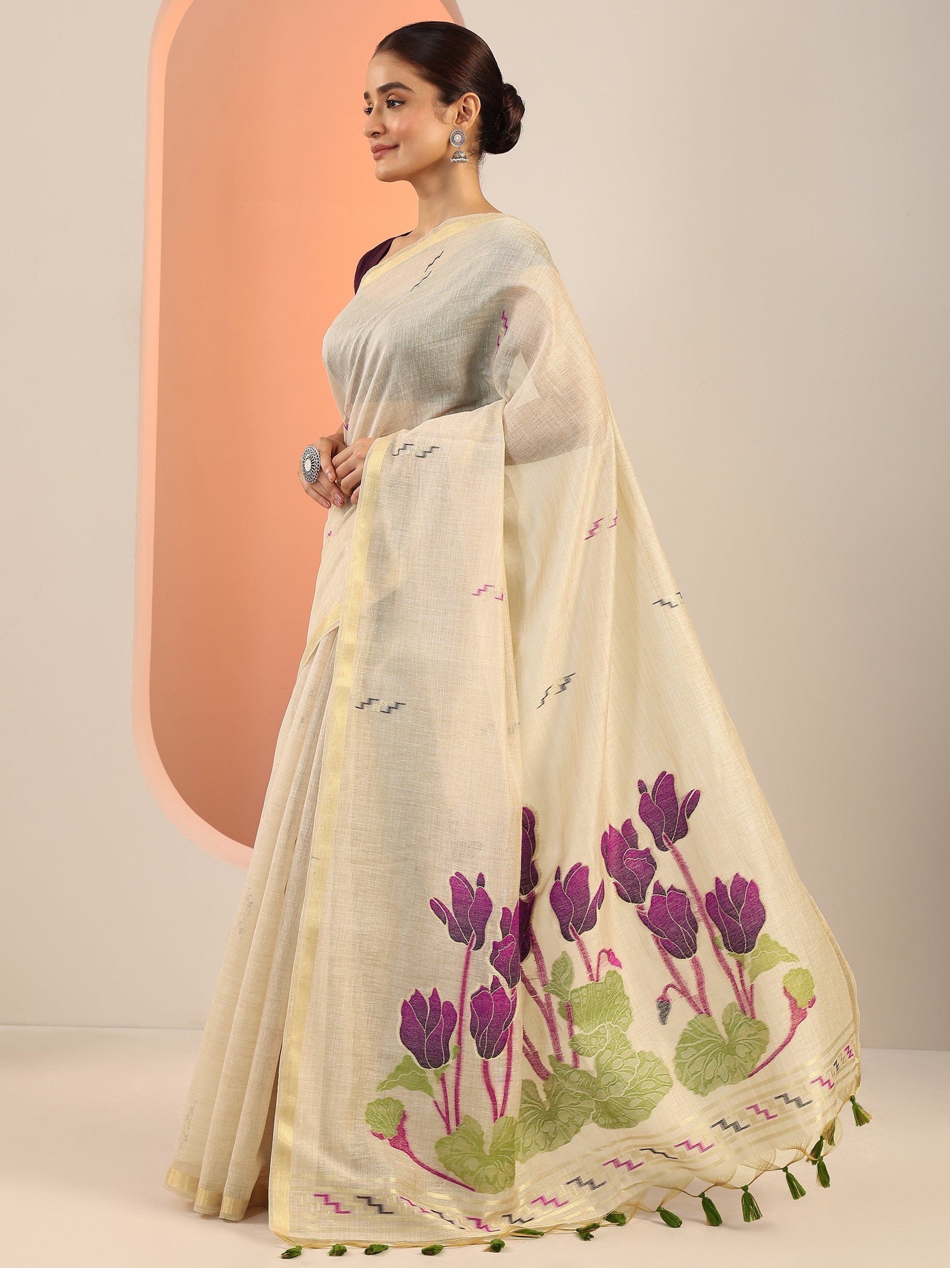 Our Off White Printed Silk Blend Saree Features Captivating Woven Print. Complemented With An Unstitched Blouse Piece. This Charming Saree Is Perfect For Festive Wear