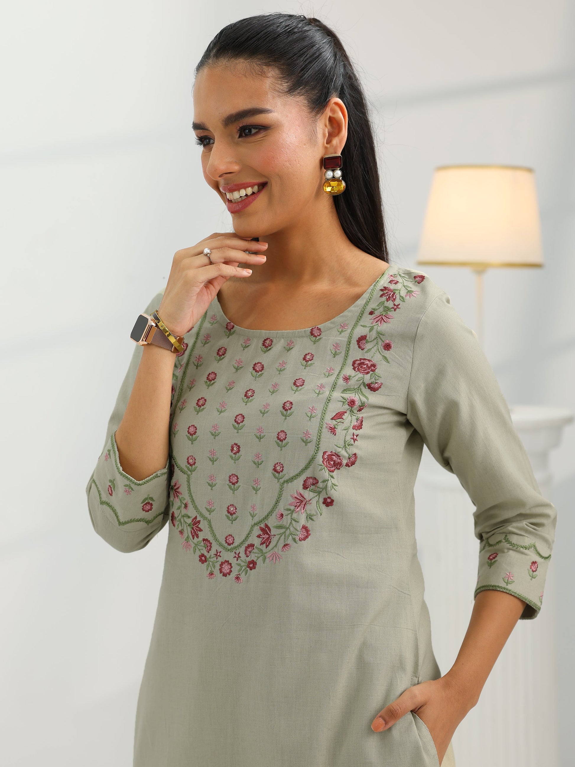 Beige Yoke Design Cotton Straight Suit Set With Dupatta