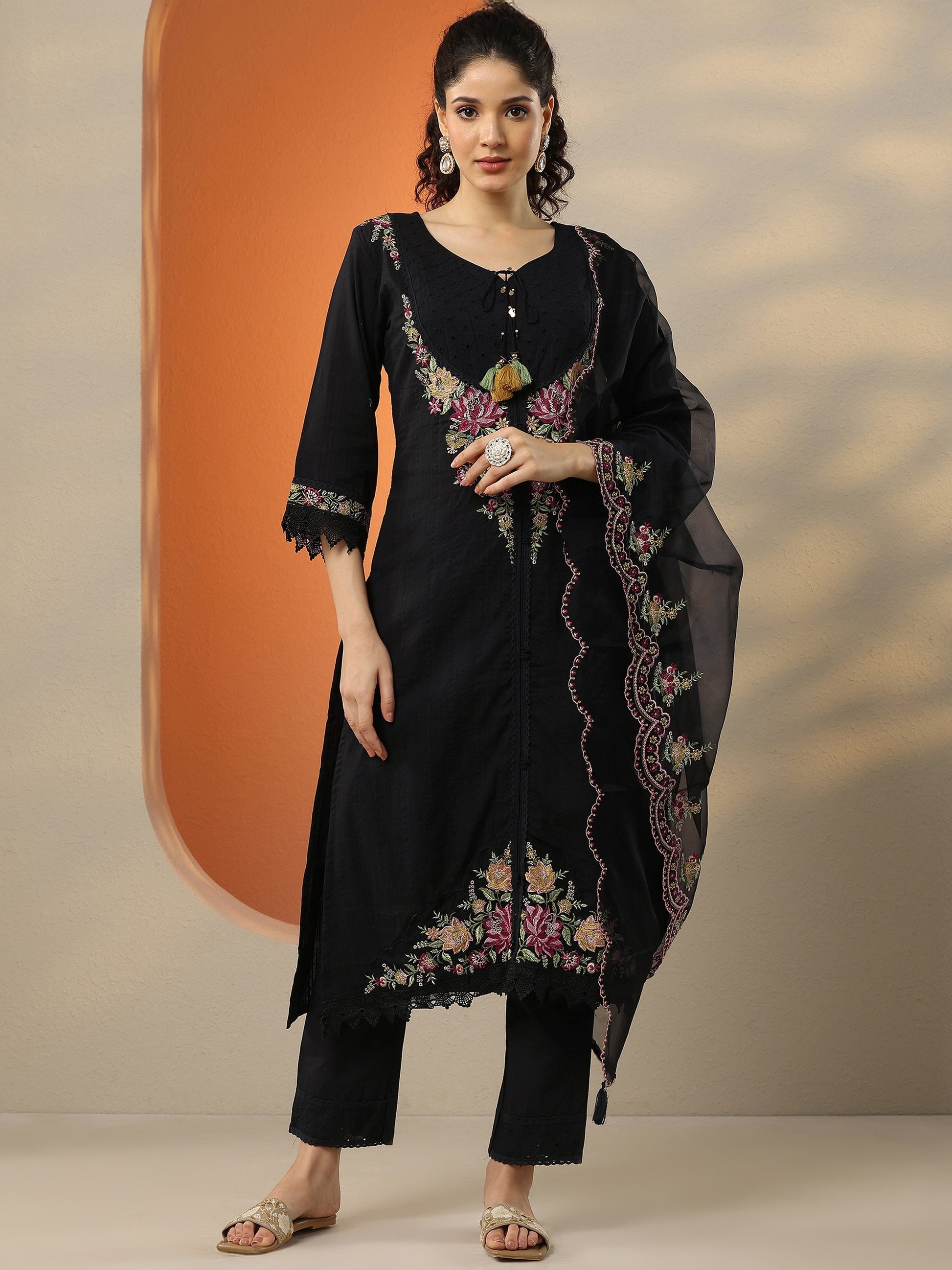 Black Embroidered Cotton Straight Suit Set With Dupatta