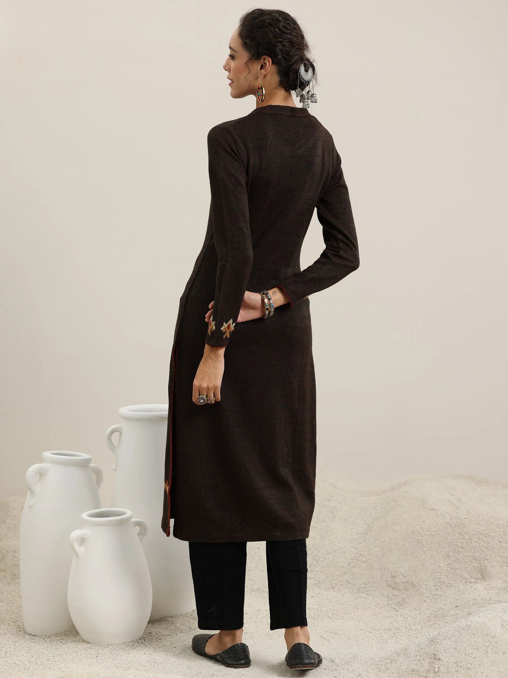 Our brown embroidered wool straight kurta features a mandarin notched neckline, comfortable full sleeves, and a statement yoke. Highlighted with intricate embroidery, this style is perfect for casual outings.