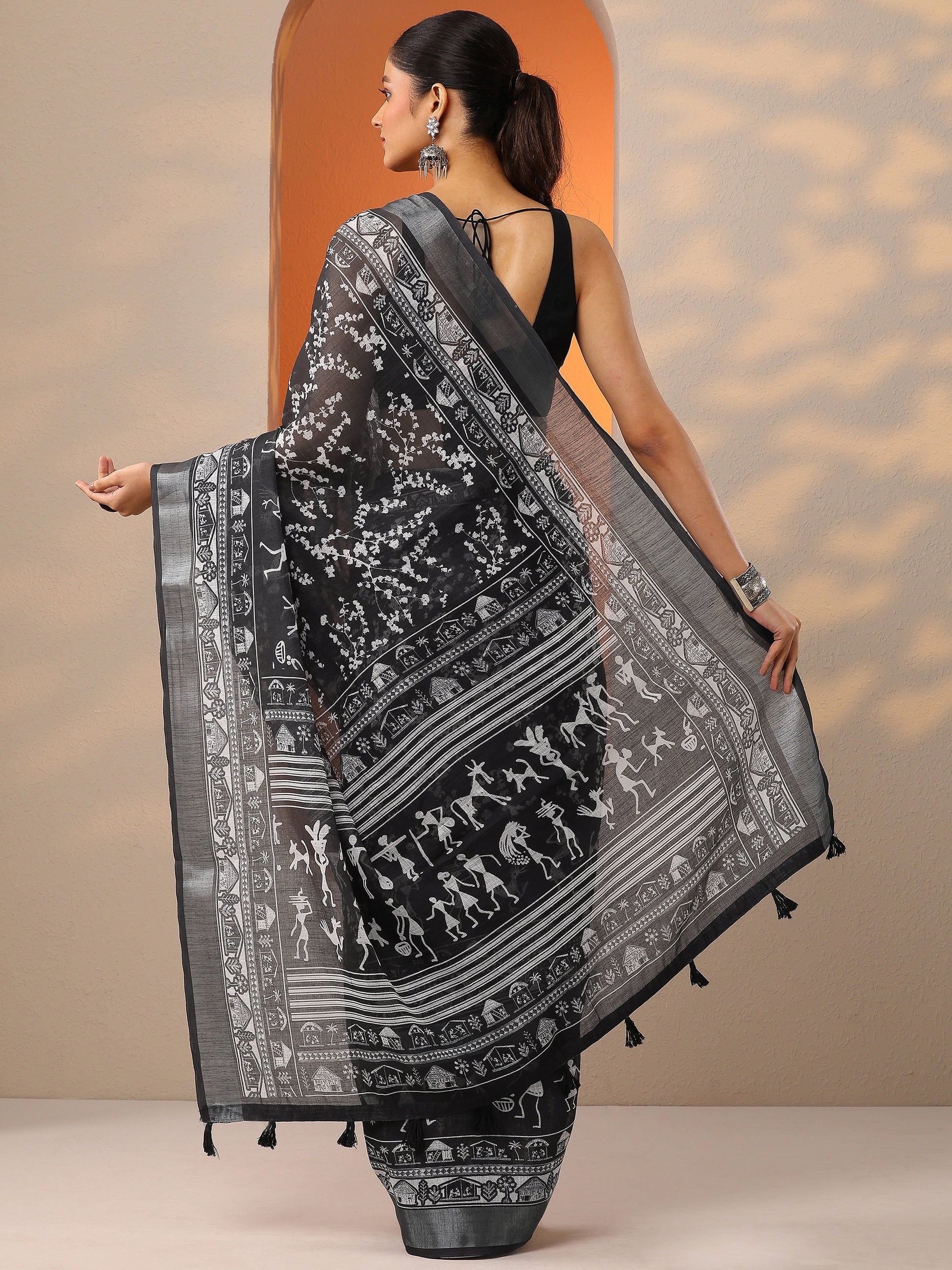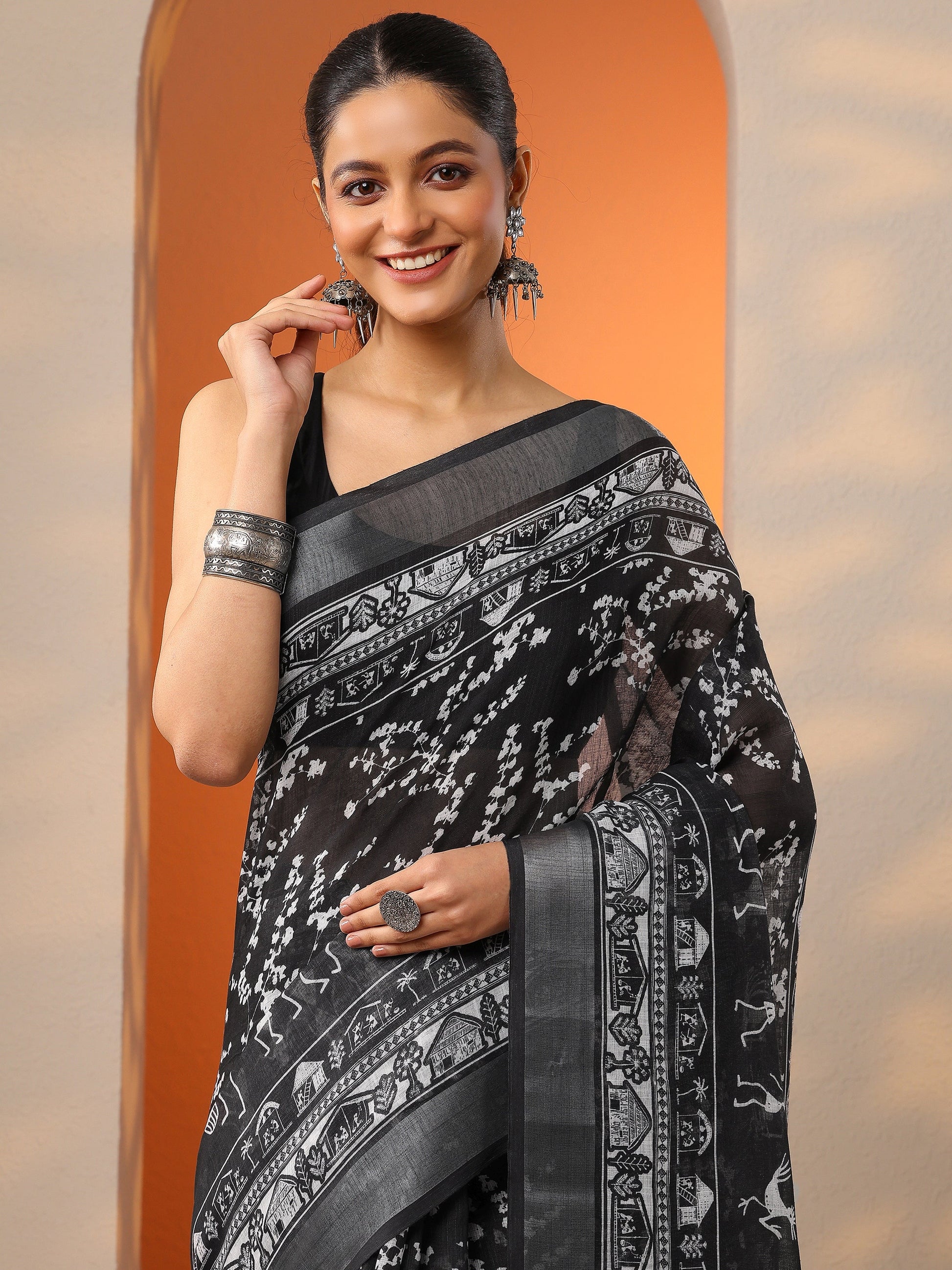 Black Printed Cotton Blend Saree With Unstitched Blouse Piece