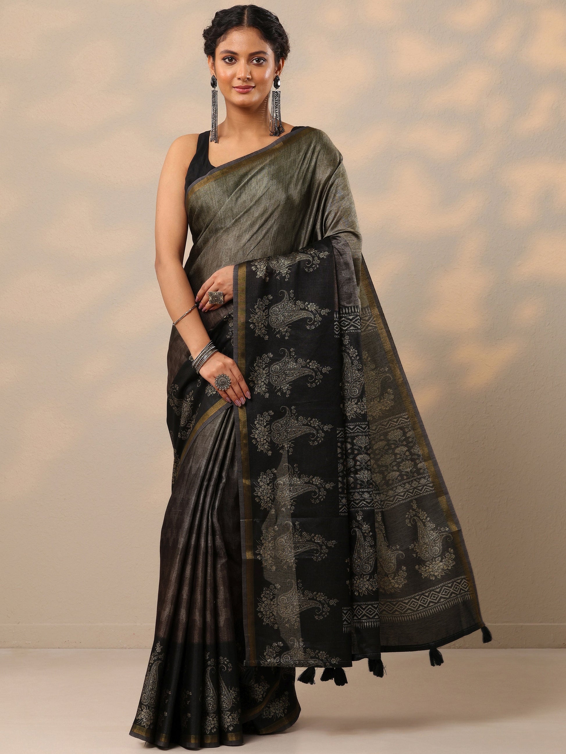 Our black printed cotton blend saree. Complemented with a blouse piece. This charming saree is perfect for occasion.