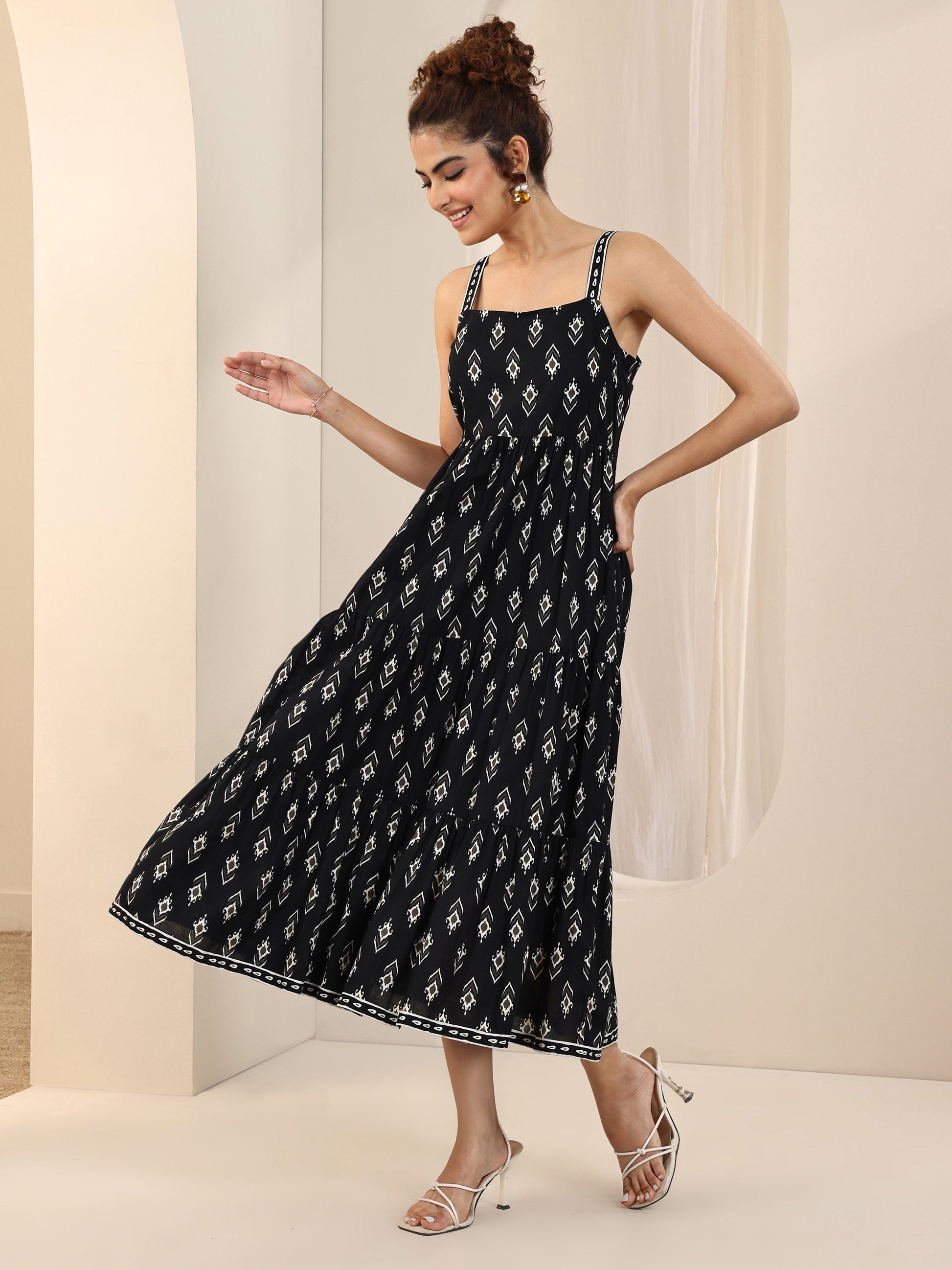 Our black printed cotton midi dress features a square neckline, sleeveless design. Highlighted with captivating printed embellishments, this style is perfect for casual outings.