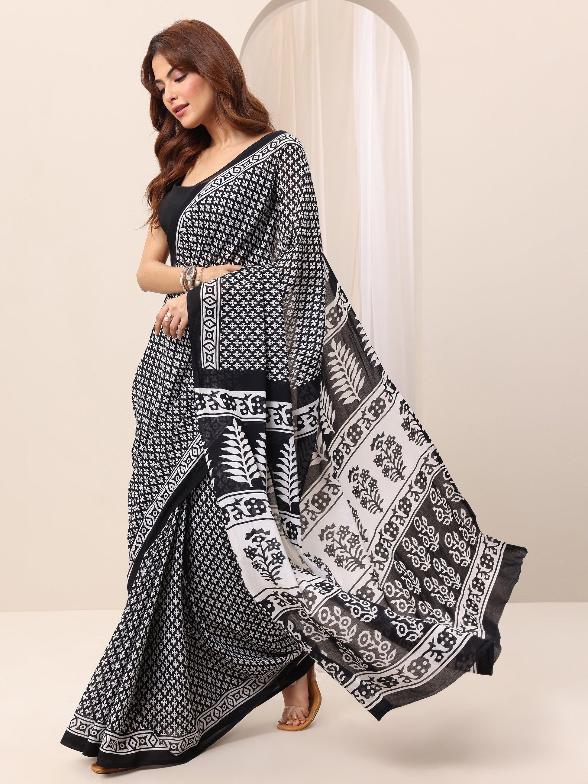 Our Black printed Cotton saree features captivating Ethnic motifs print. Complemented with a Blouse Piece. This charming saree is perfect for Casual occasions.