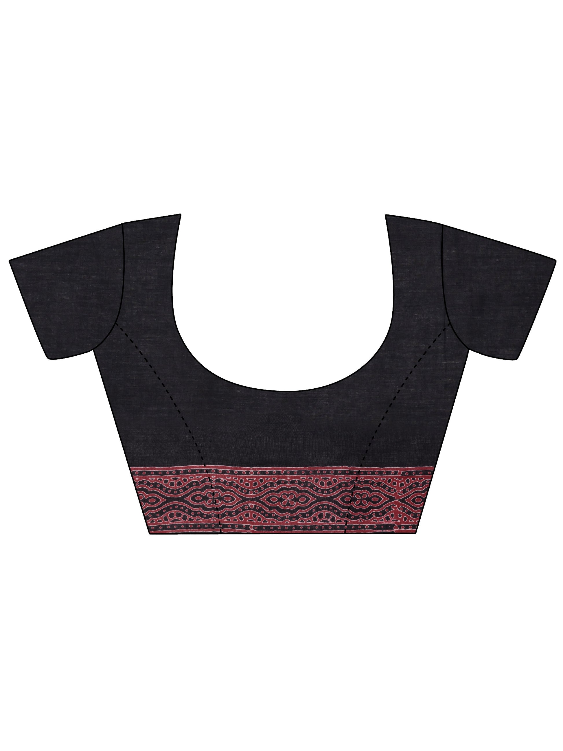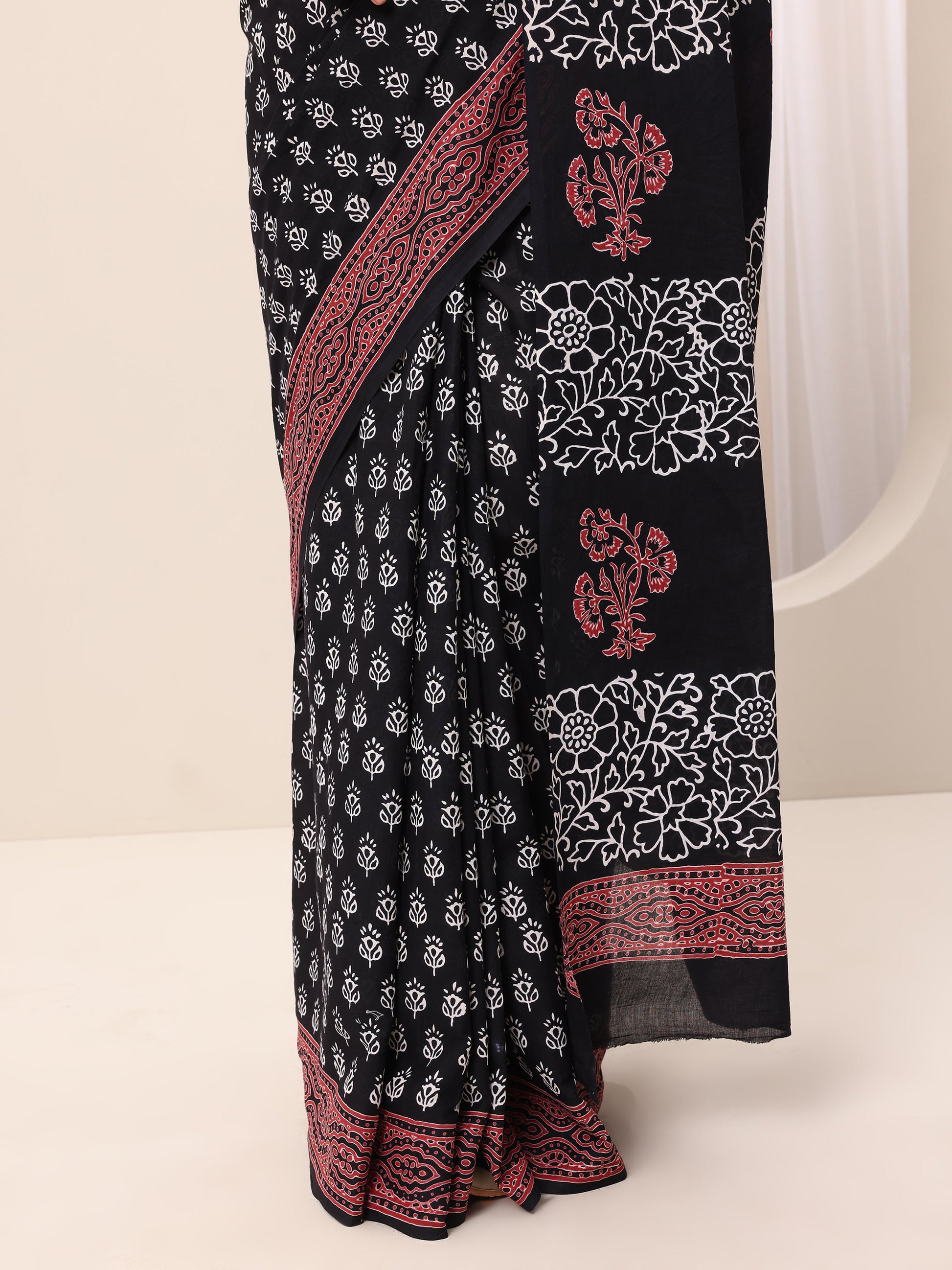 Black Printed Cotton Saree With Unstitched Blouse Piece