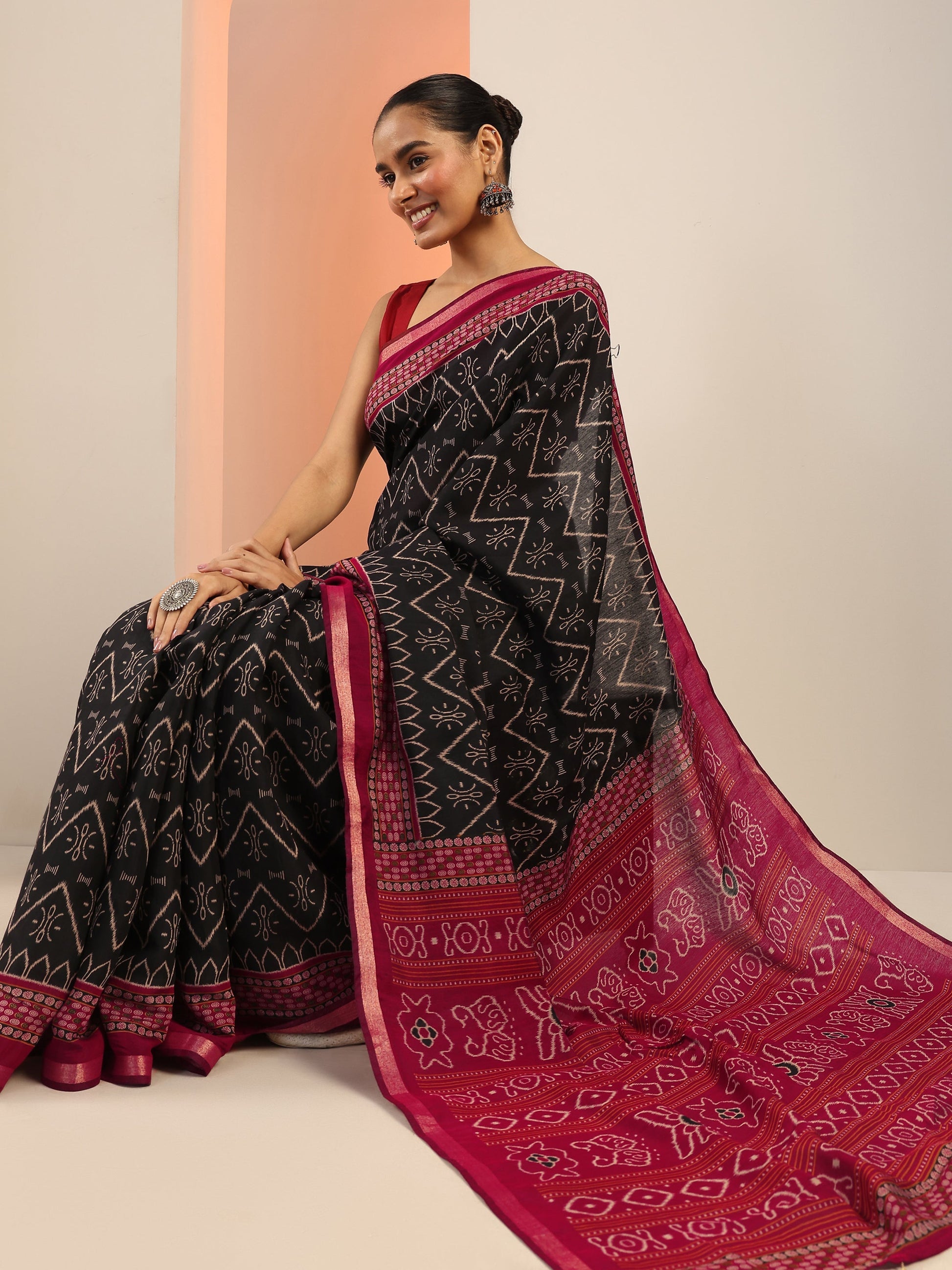 Black Printed Cotton Saree With Unstitched Blouse Piece