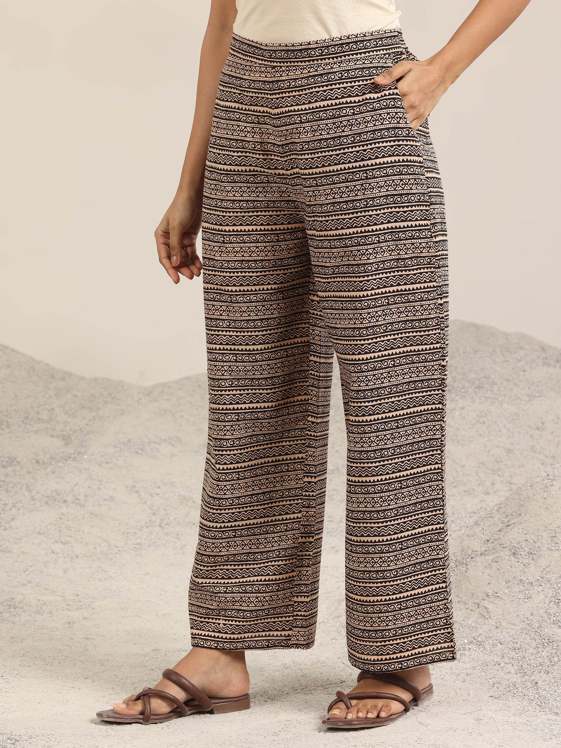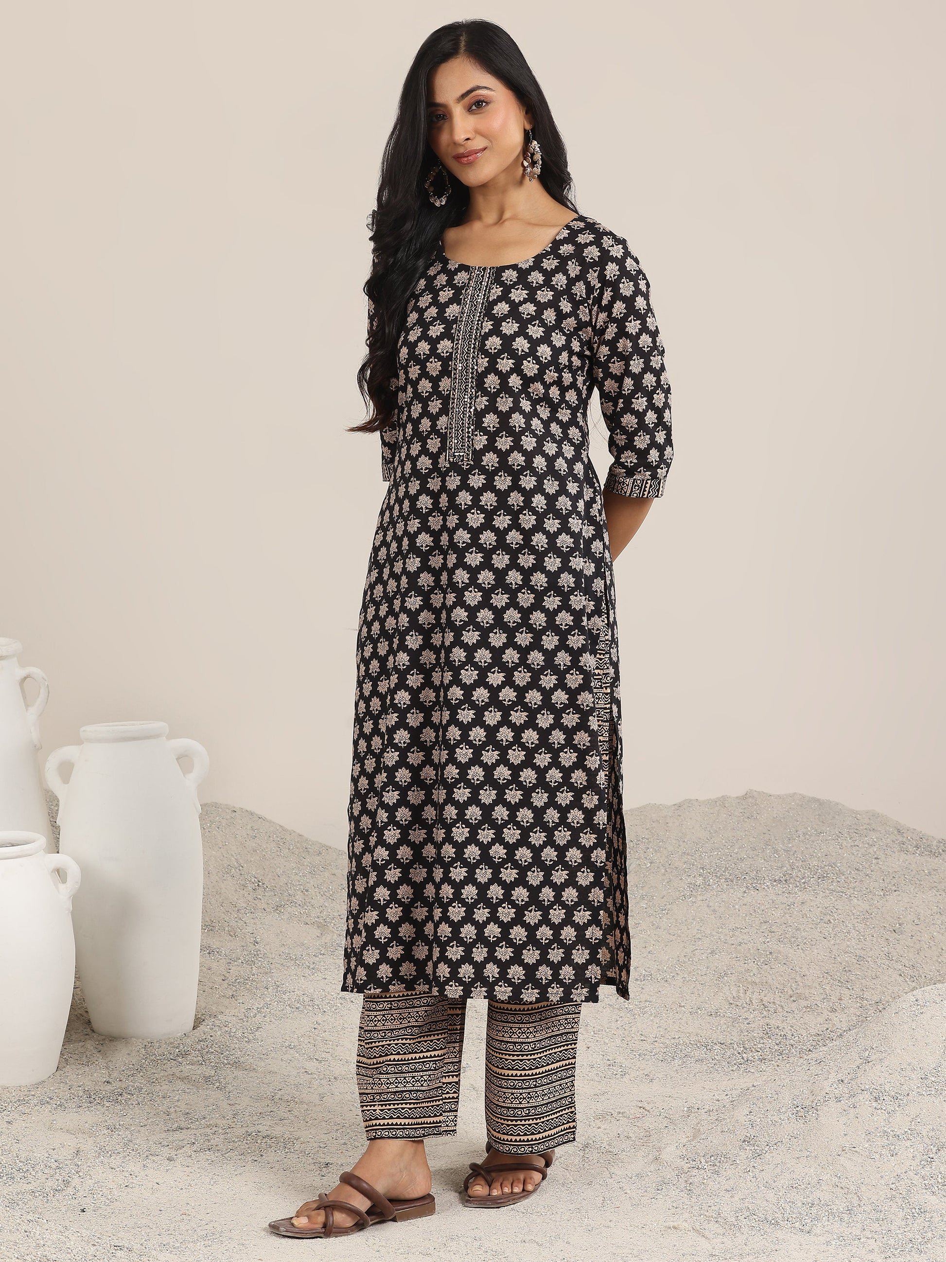 Our 3-piece black printed cotton blend suit set features a kurta with a round neckline and three-quarter sleeves. Complemented with trousers with a partially elasticated waistband and roomy pockets, and a dupatta. Highlighted with sequins and ethnic motifs prints, this style is perfect for elevated everyday style.