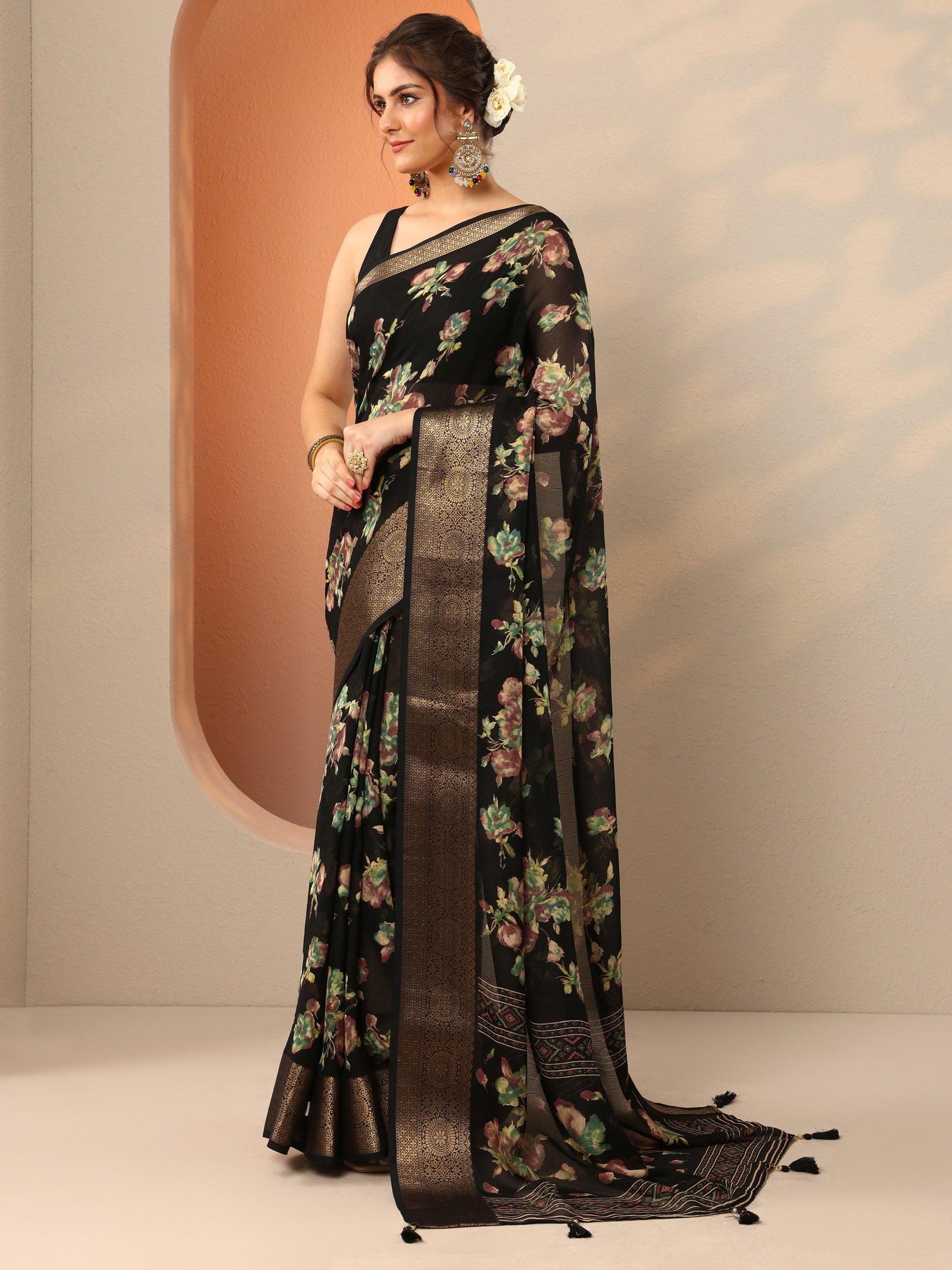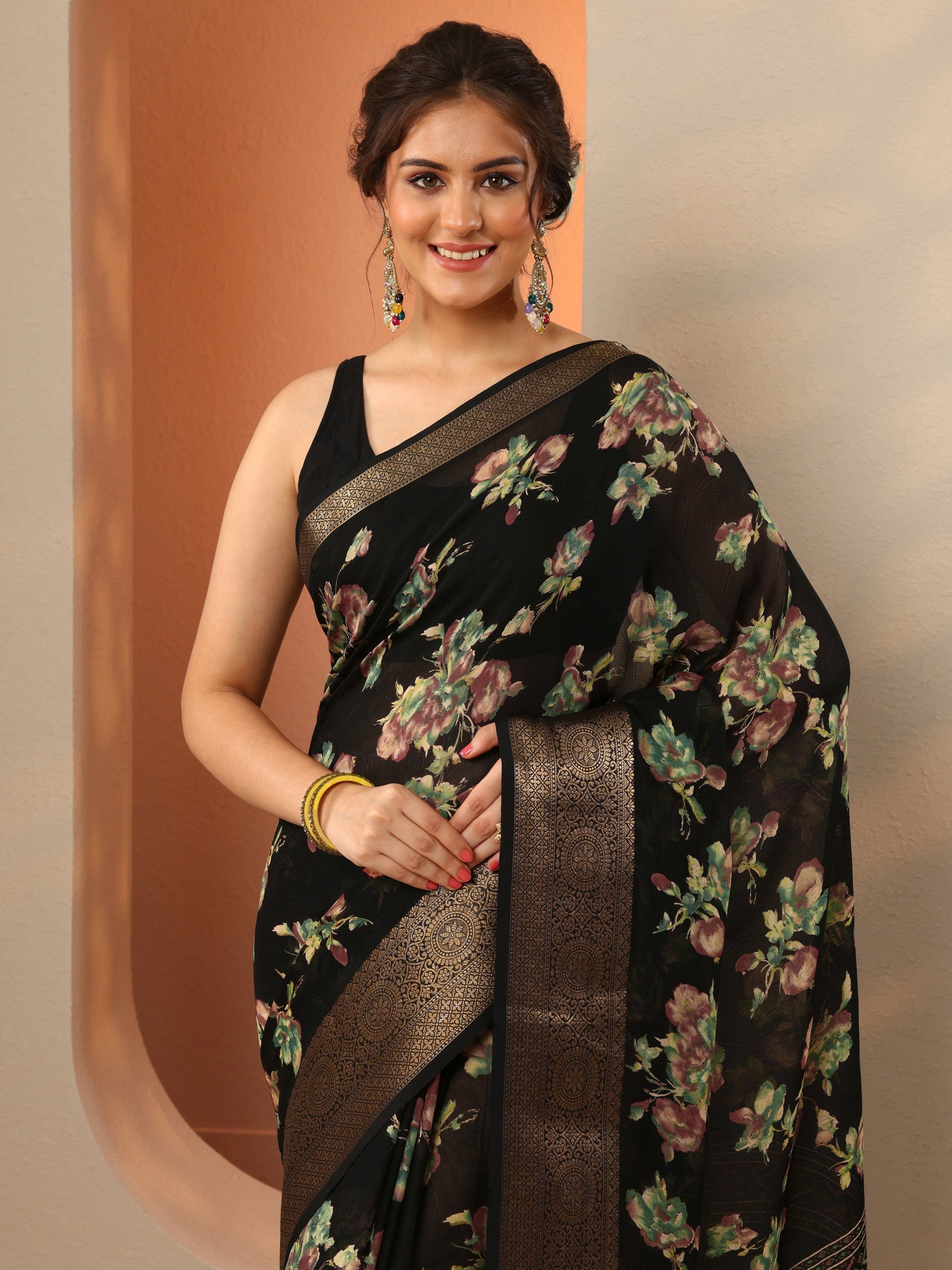 Black Printed Georgette Saree With Unstitched Blouse Piece