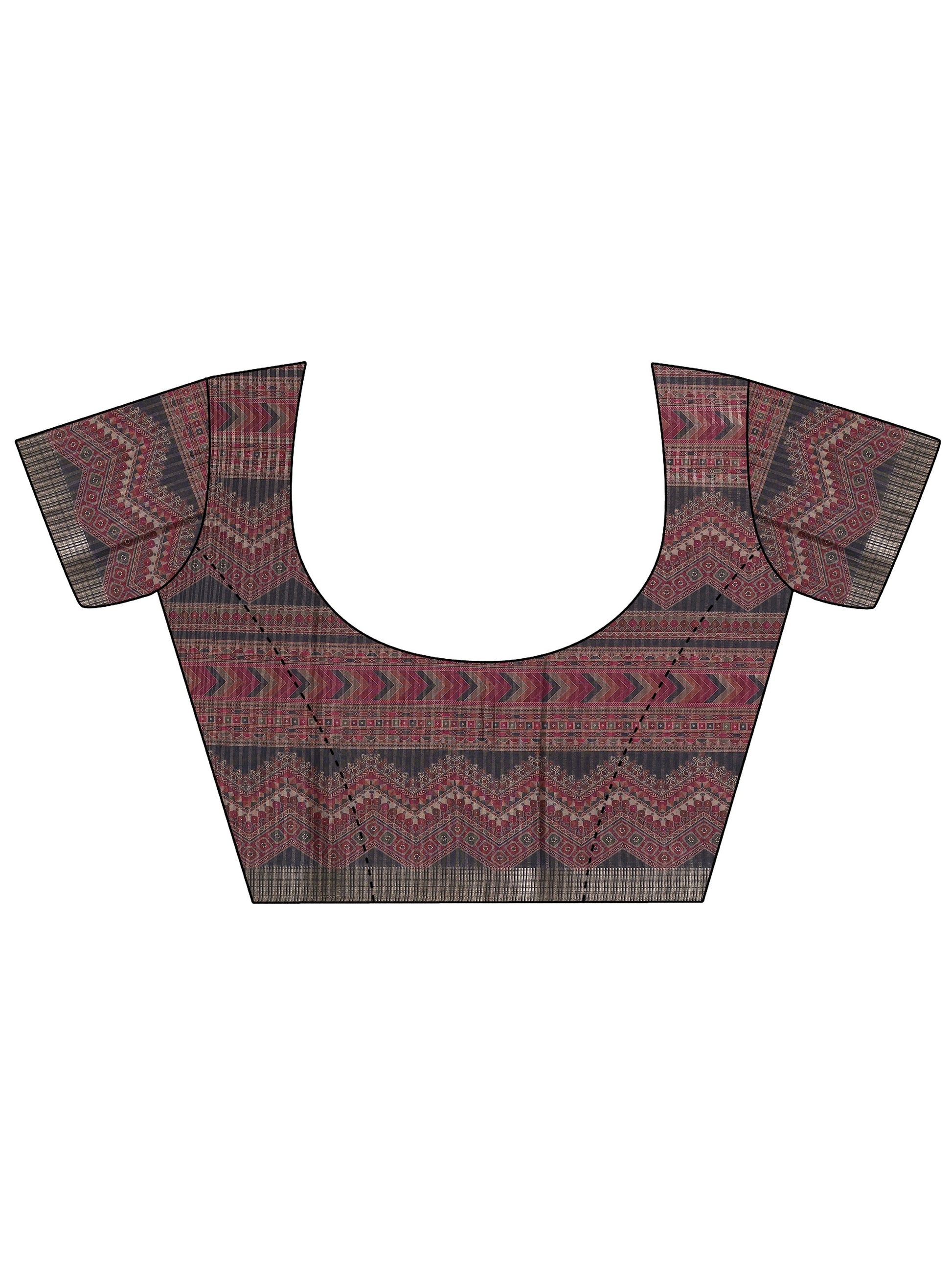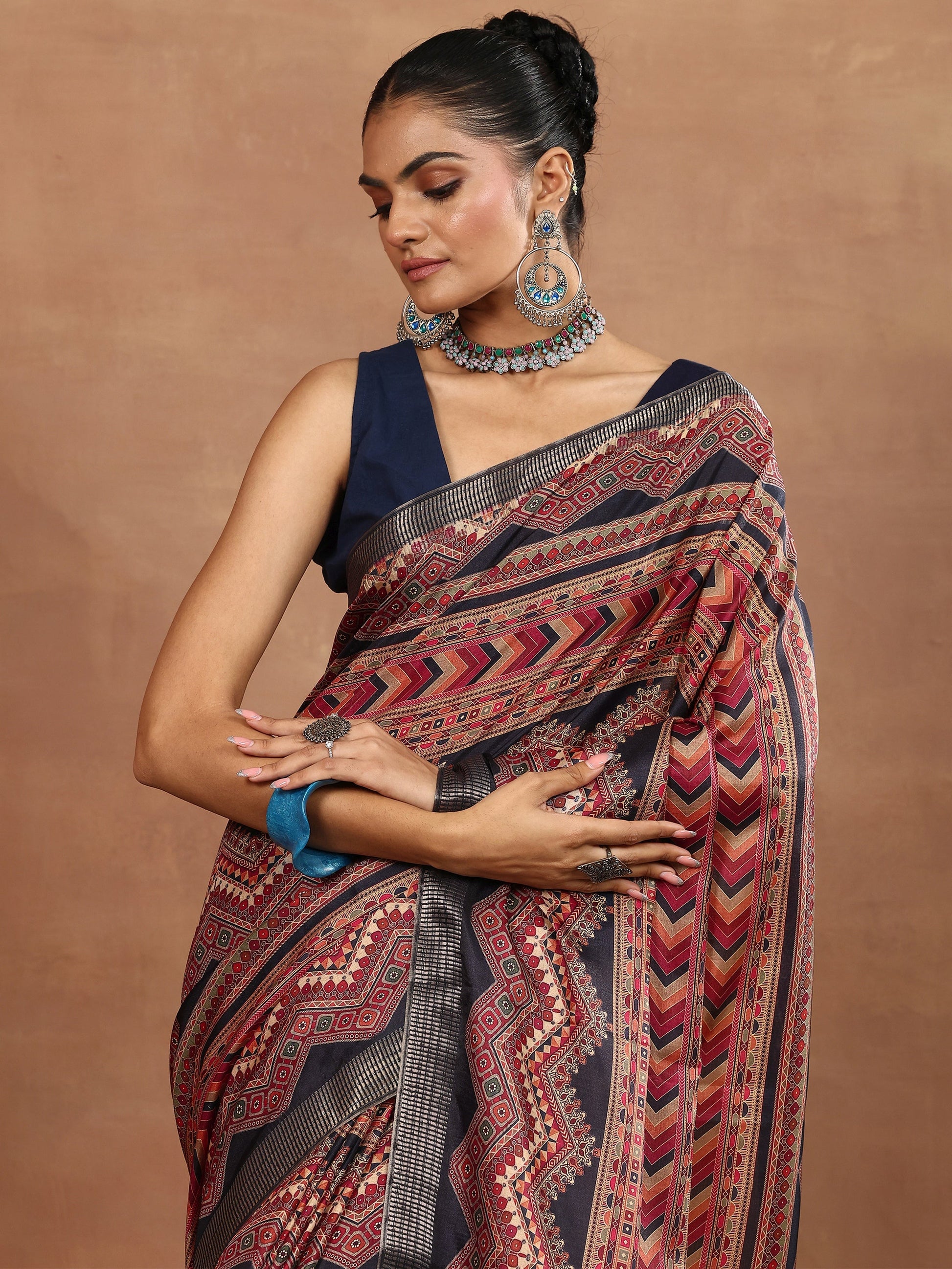 Black Printed Silk Blend Sarees With Unstitched Blouse Piece