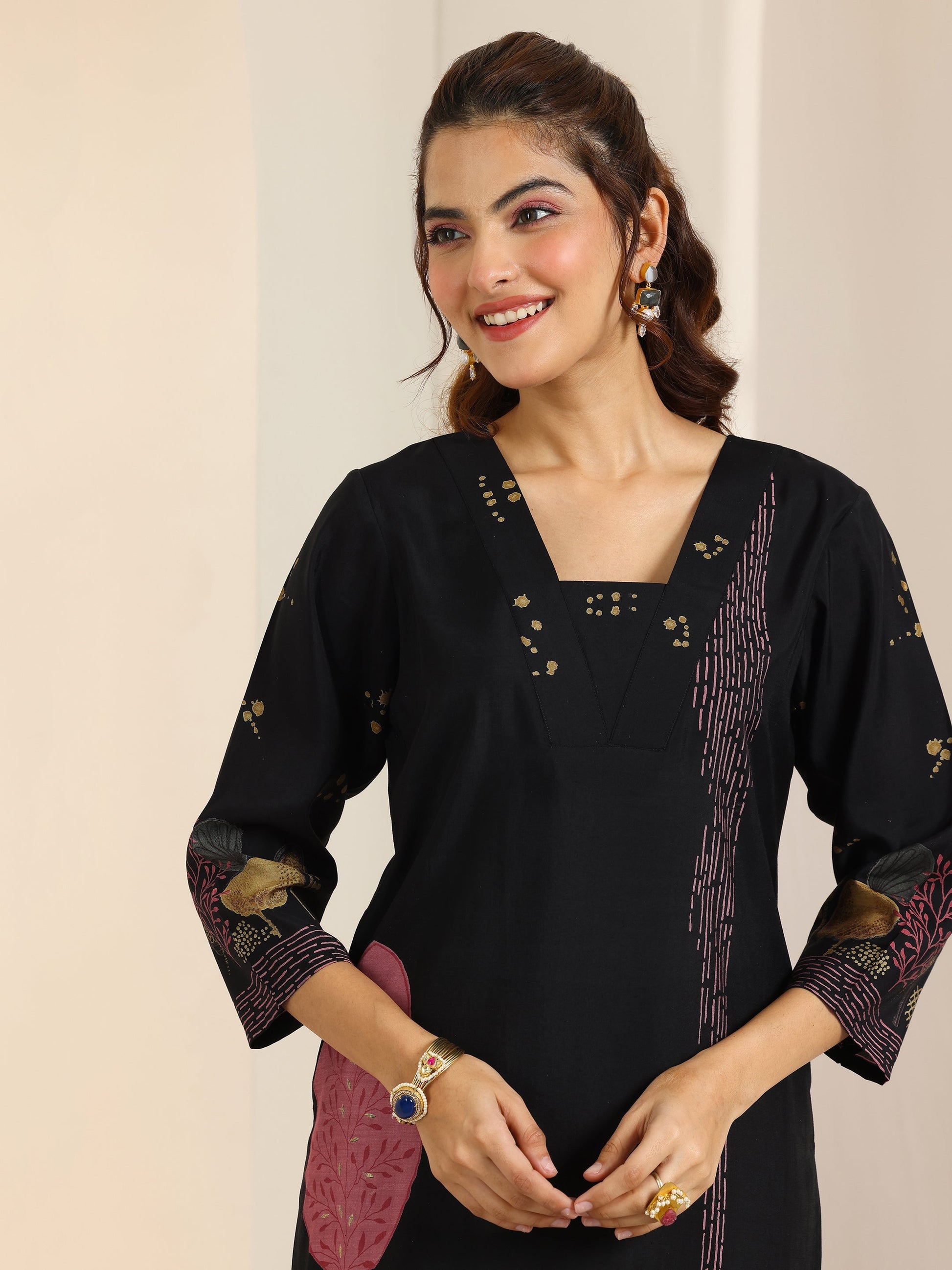 Black Printed Silk Blend Straight Suit Set With Dupatta