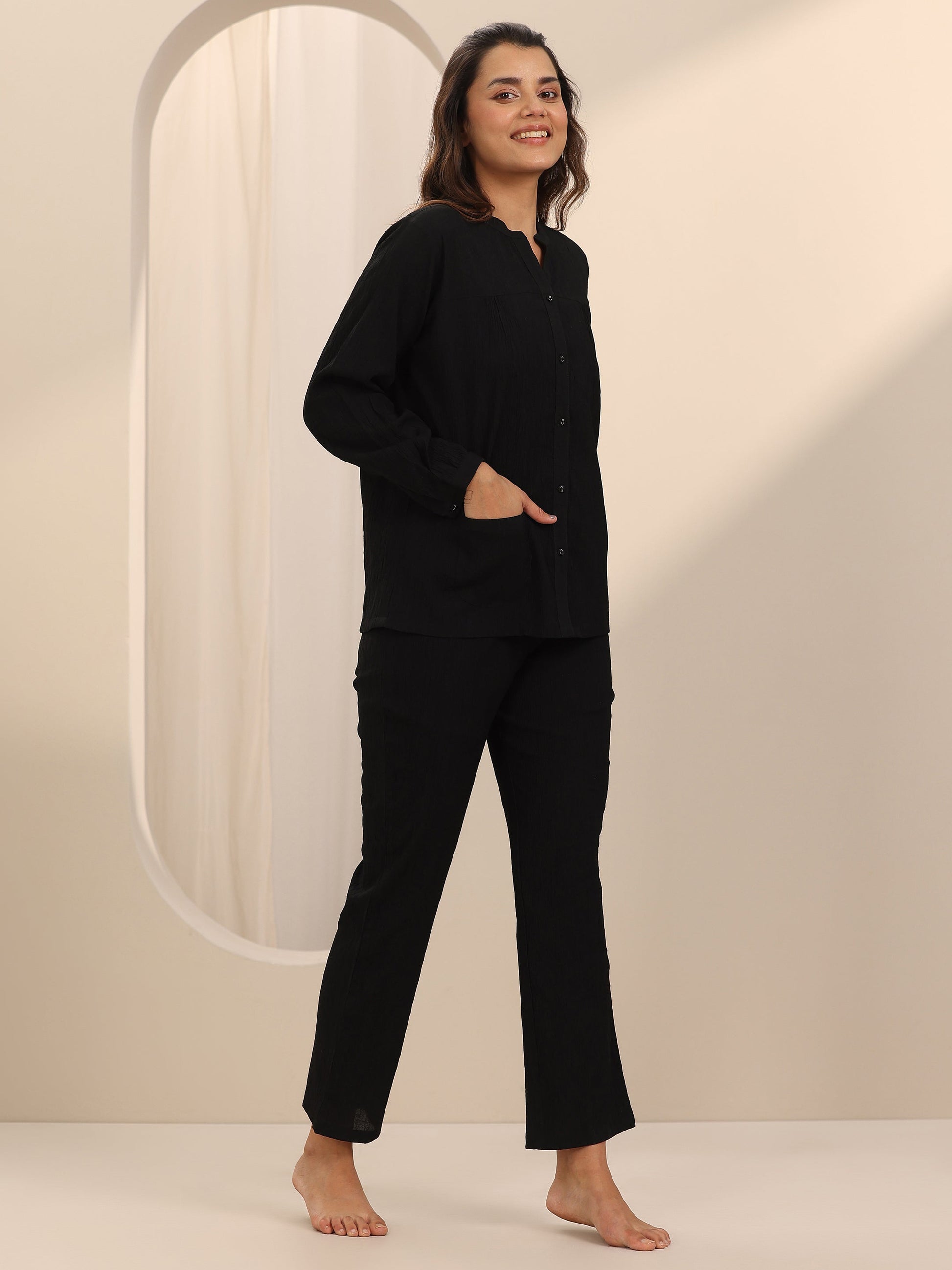 Our 2-piece black cotton blend nightsuit features a shirt with a shirt collar neckline and long sleeves. Complemented with matching pyjamas with an elasticated waistband and 2 pockets. Elevated with solid design, this style is perfect for casual wear.
