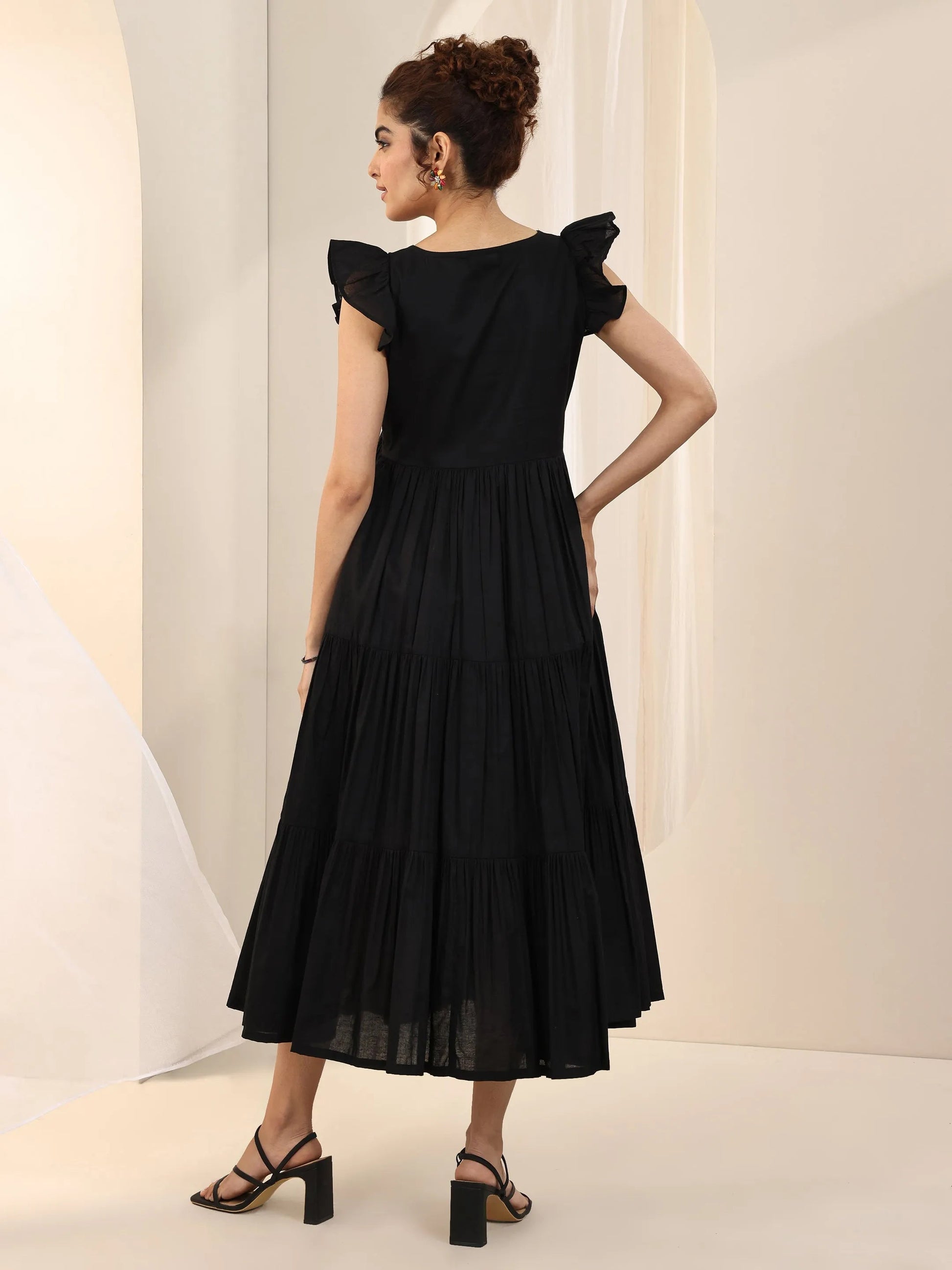 Our black cotton maxi dress features a V-neckline, sleeveless design, and a flared hemline. Highlighted with captivating solid embellishments, this style is perfect for casual wear.