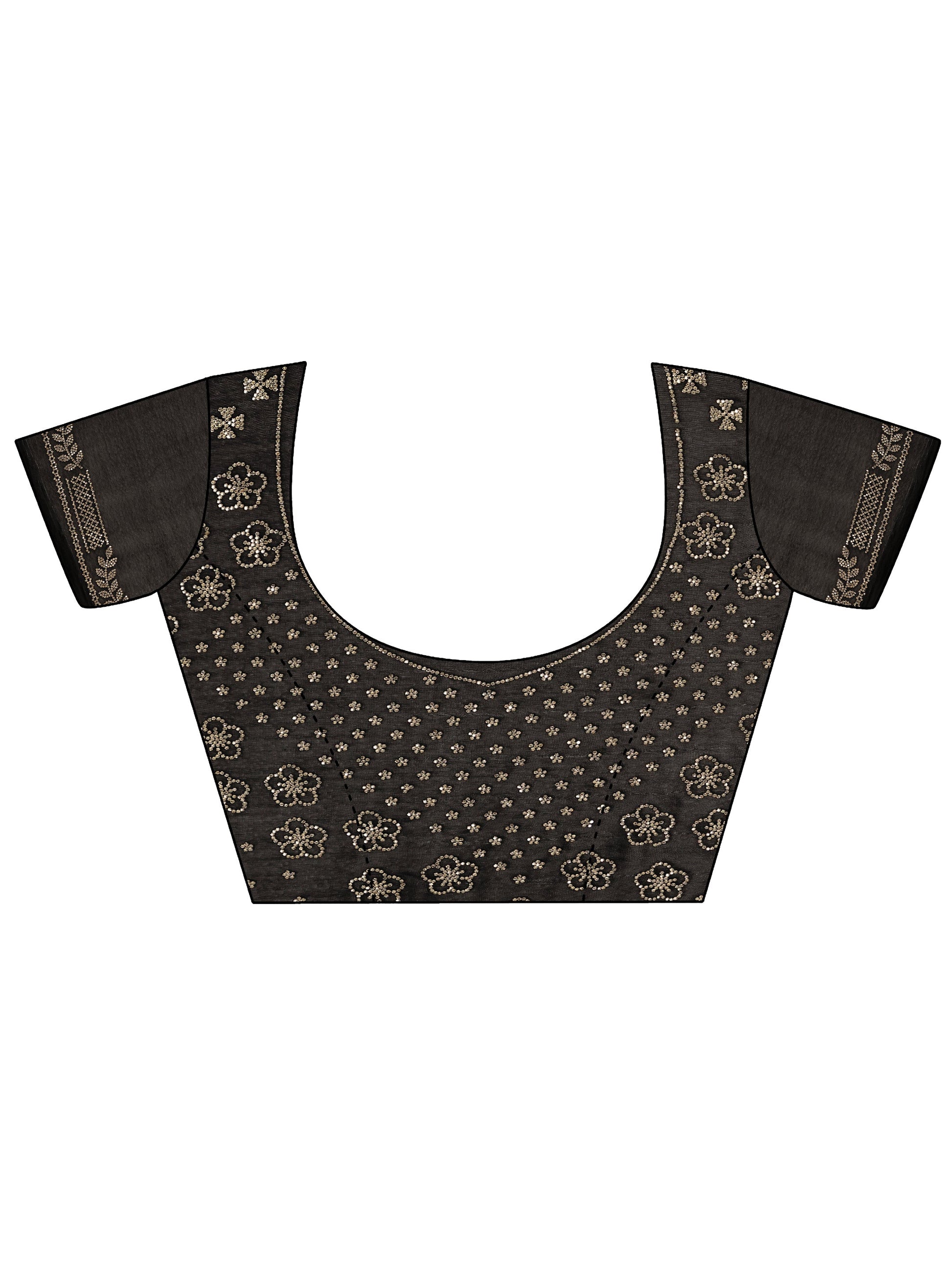 Our black satin saree features captivating solid embellishments. Complemented with a stitched blouse. This charming saree is perfect for dark festive occasions.