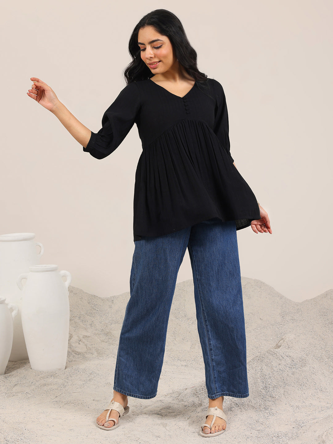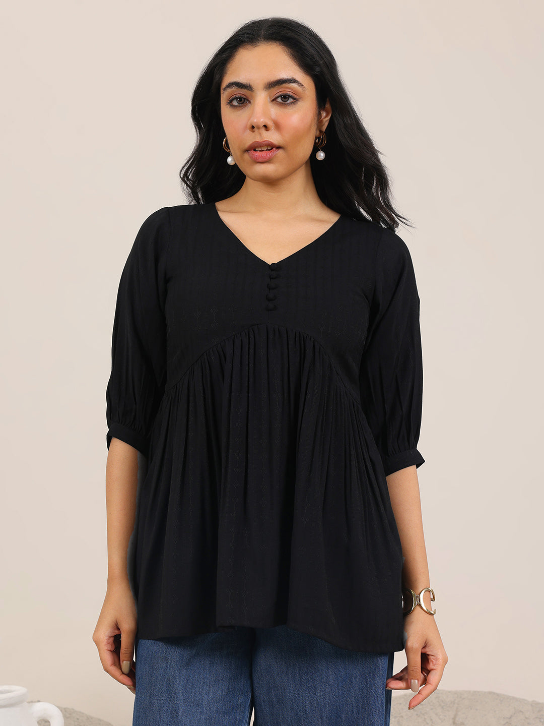 Our 1-piece black silk blend A-line kurta features a V-neckline, regular sleeves and statement Yoke. Adorned with solid, this style is perfect for casual wear.