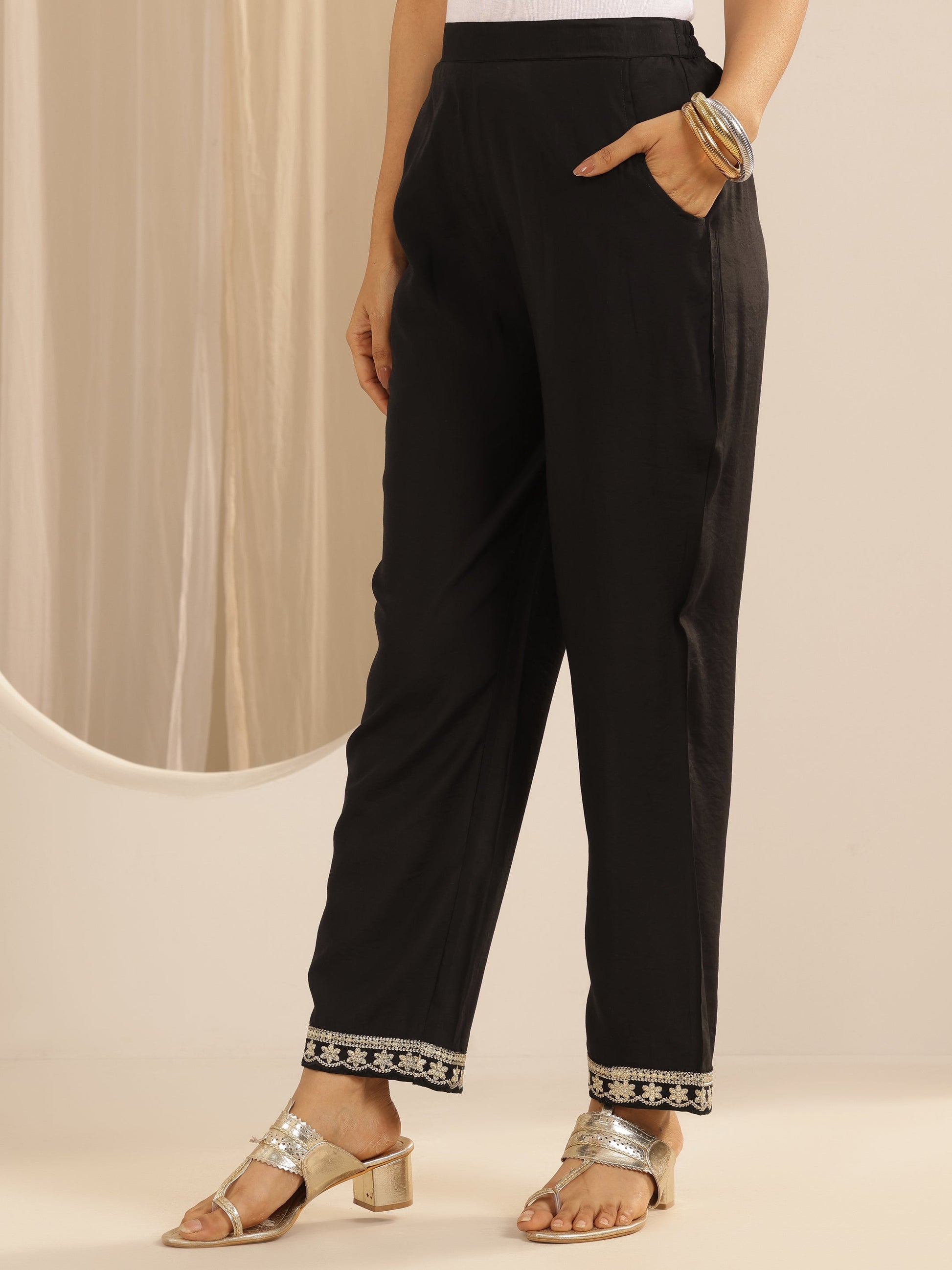 Our 3-piece Black Silk Blend Straight-fit Kurta Set features a V-Neckline, Regular Sleeves, and statement yoke. Complemented with Straight Pants with a Partially Elasticated waistband and 2 pockets, and an Embroidered dupatta. Adorned with Embellished accents, this style is perfect for Festive Wear.
