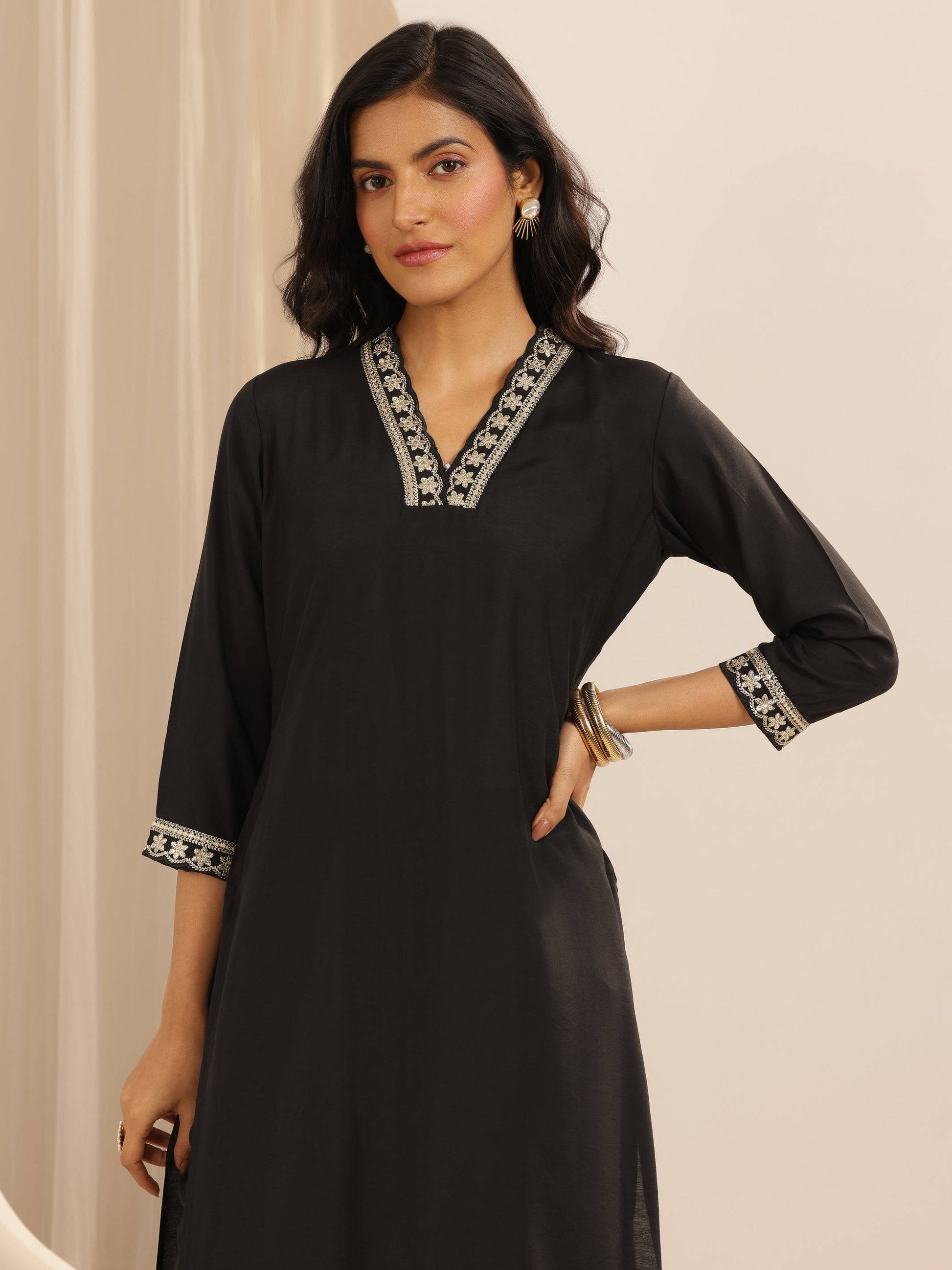 Black Solid Silk blend Straight Suit Set With Dupatta