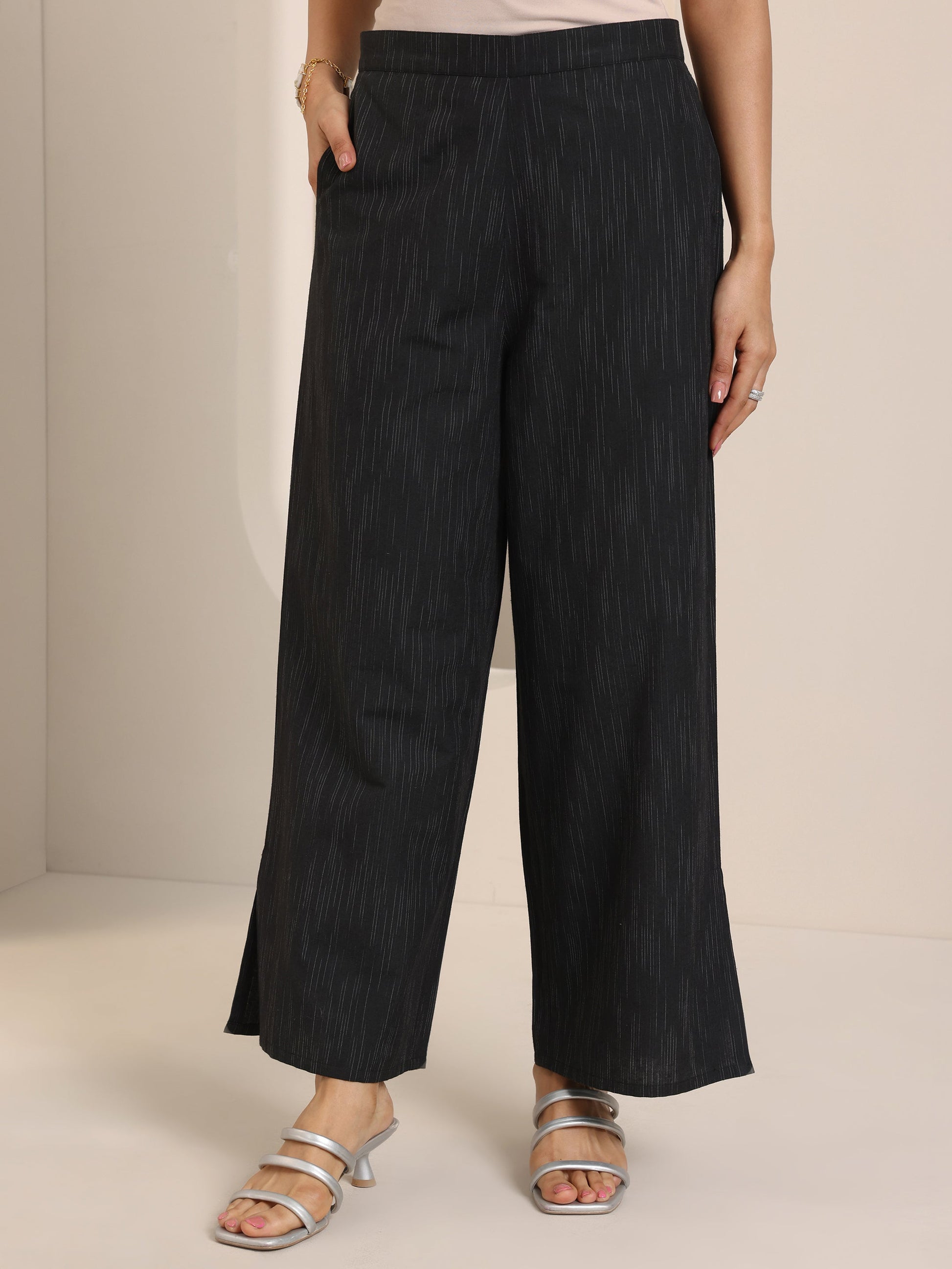 Our 3-piece Black Cotton Blend features a Straight-fit Kurta Set with a V-neckline, and statement Yoke. Complemented with Palazzo Pants with an Elasticated waistband and a Printed dupatta. Adorned with Self Design, this style is perfect for Casual occasions.