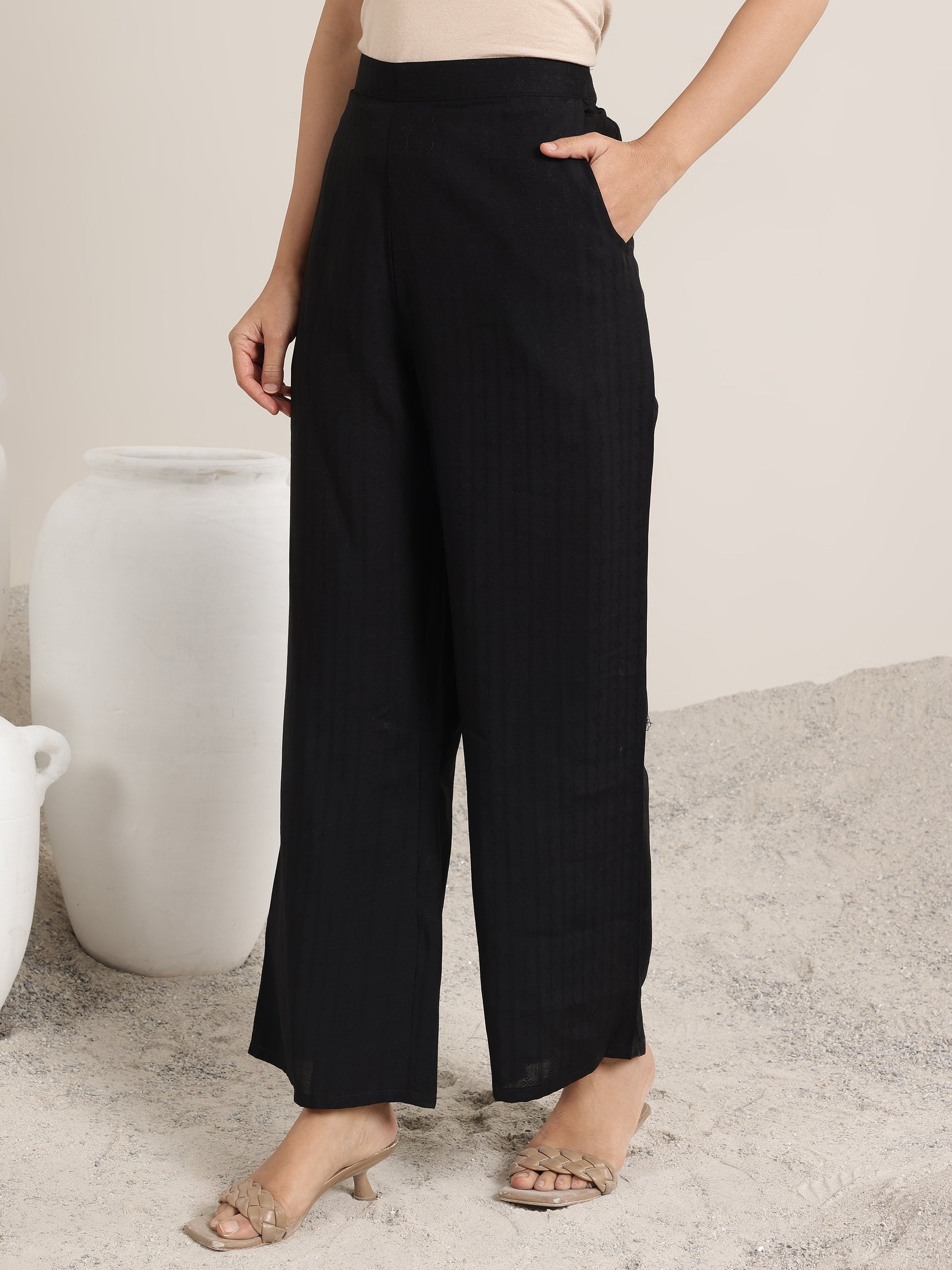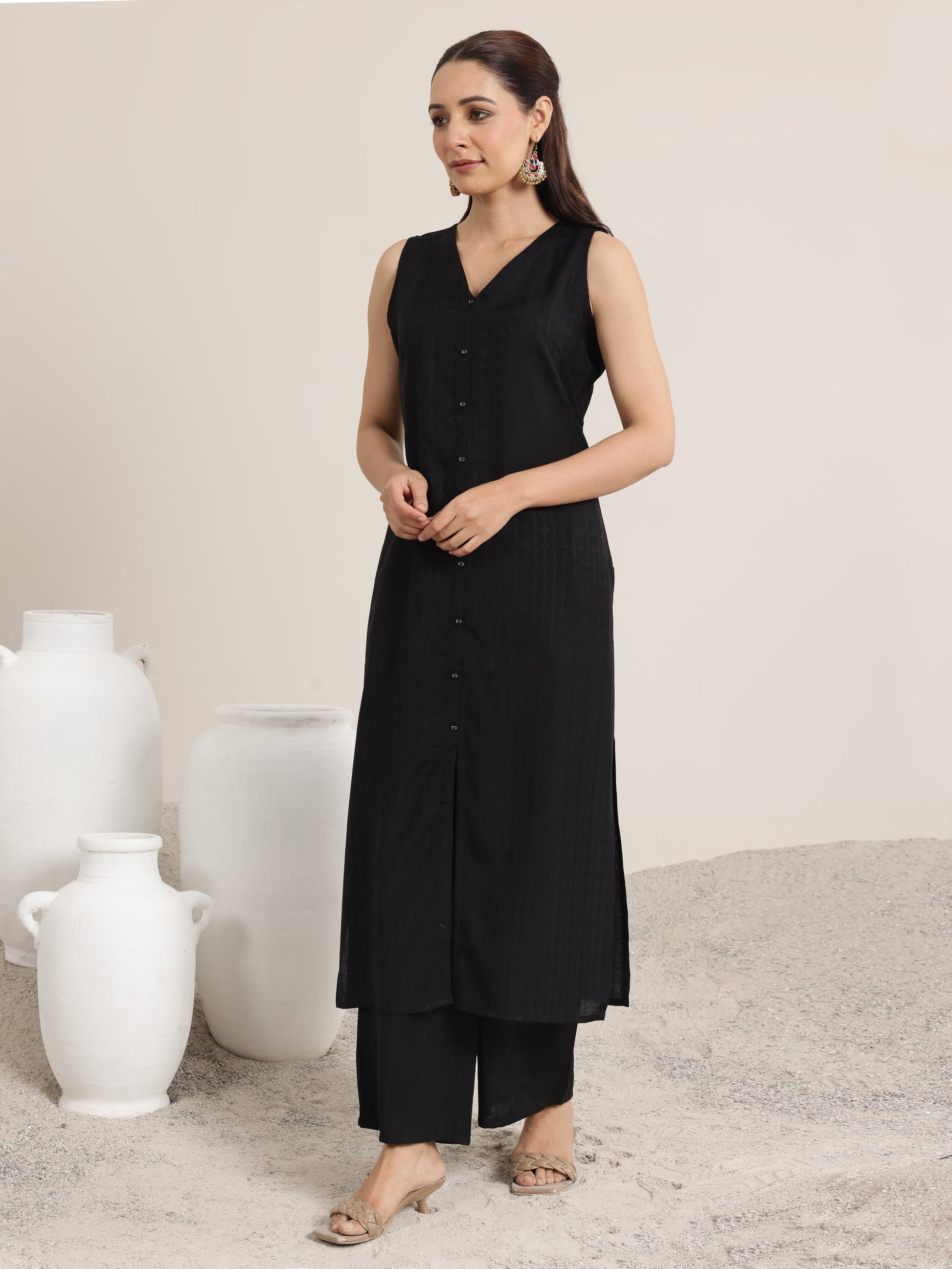 Our 3-piece black woven design silk blend straight suit set features a sleeveless kurta with a V-neckline and a buttoned down detailing. Complemented with trousers with a partially elasticated waistband and roomy pockets, and a printed dupatta. Elevated with ethnic motifs print and woven patterns, this style is perfect for casual outings.