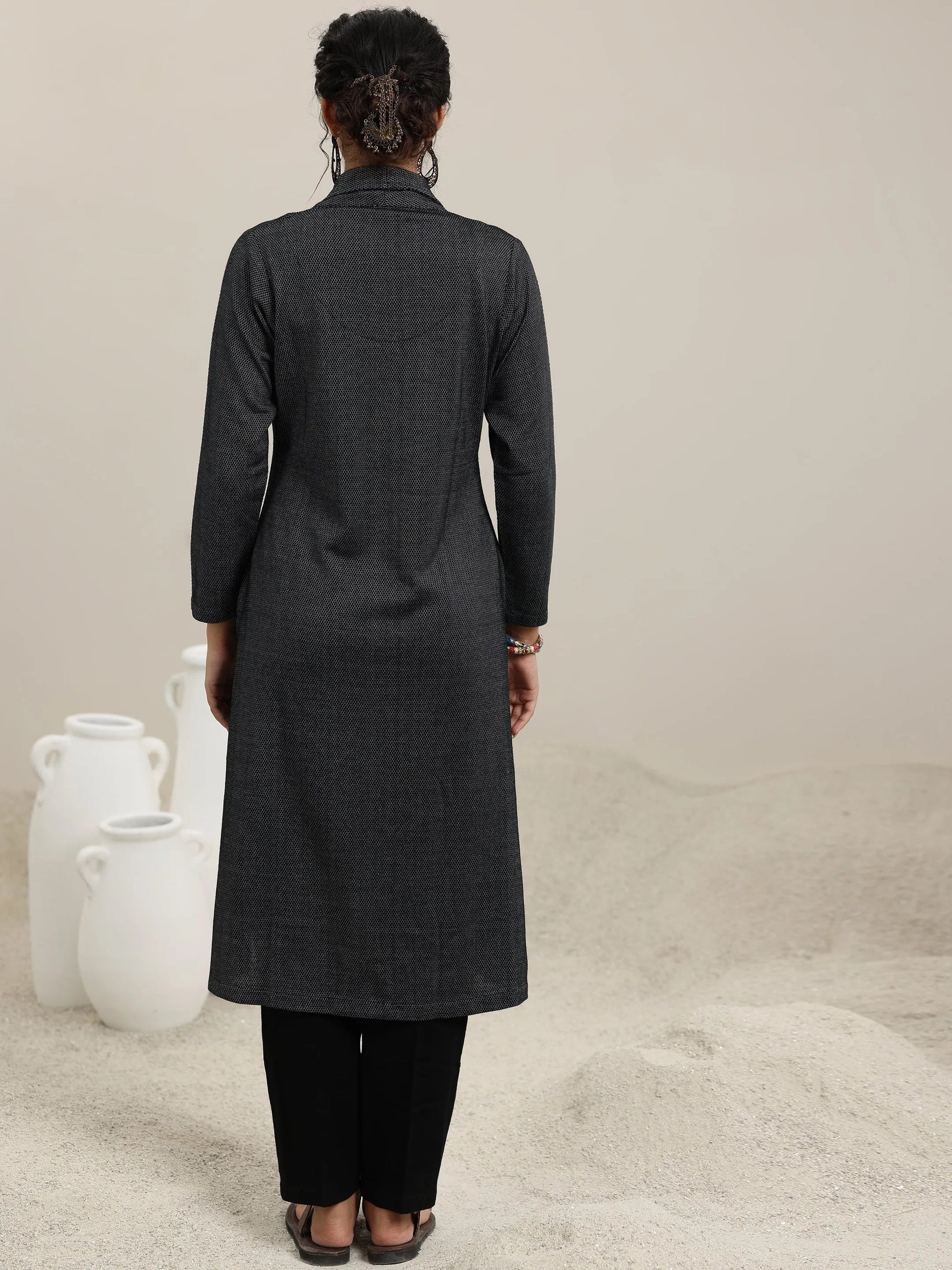 Our black woven design wool kurta features a lapel collar, comfortable full sleeves, and buttoned-down detailing. Highlighted with stylish button accents, this style is perfect for casual outings.