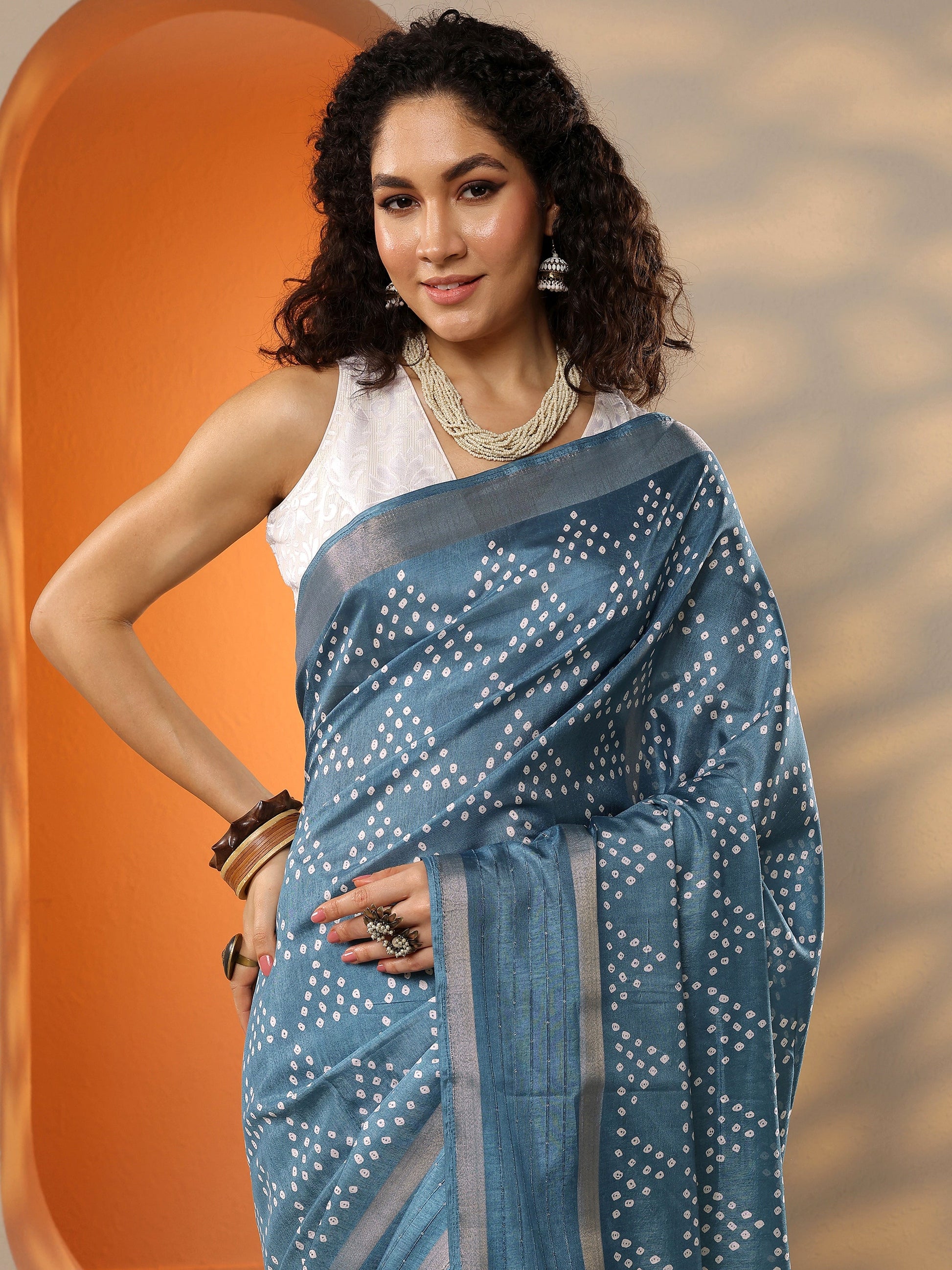 Blue Bandhani Printed Silk Blend Saree With Unstitched Blouse Piece