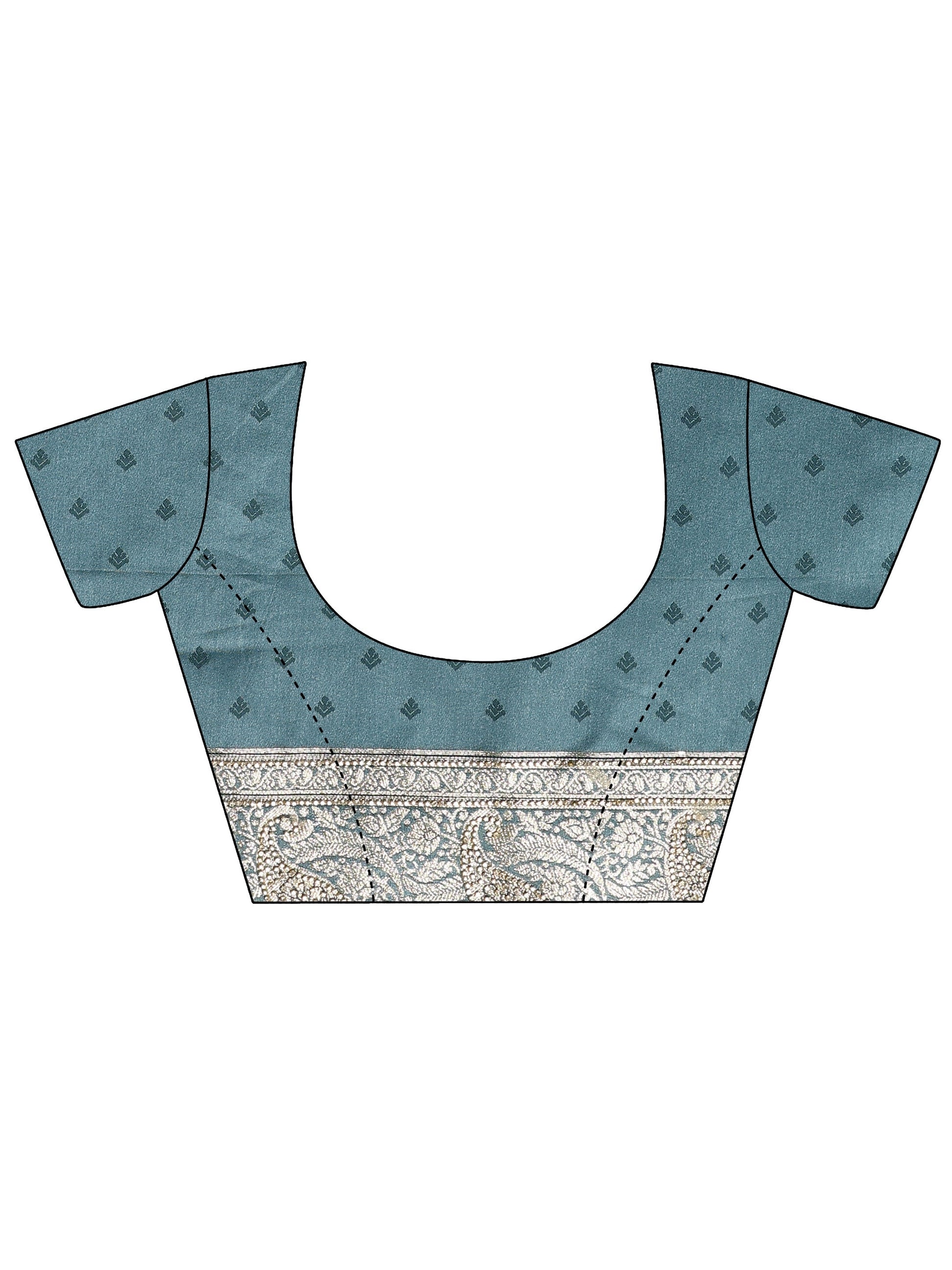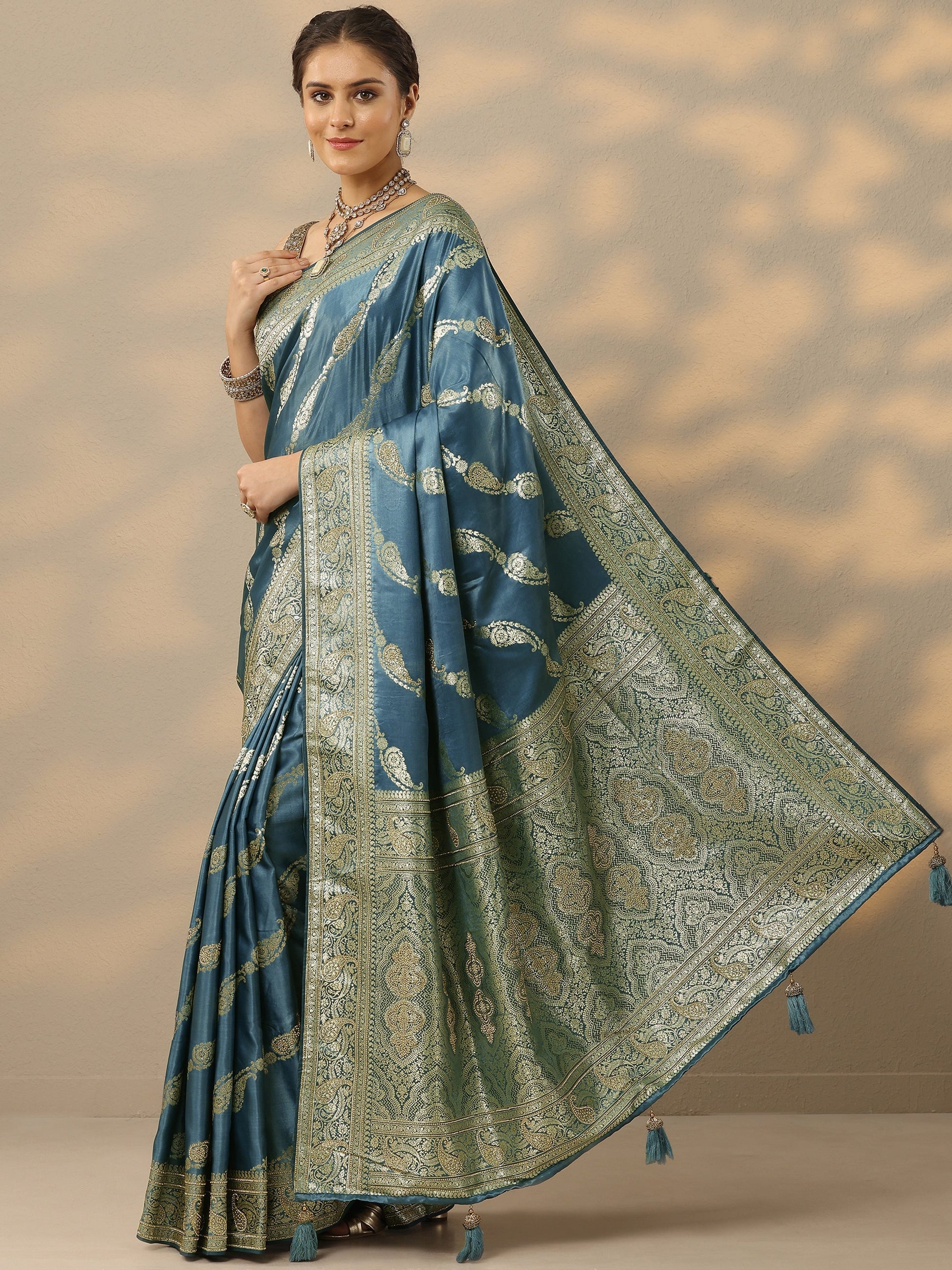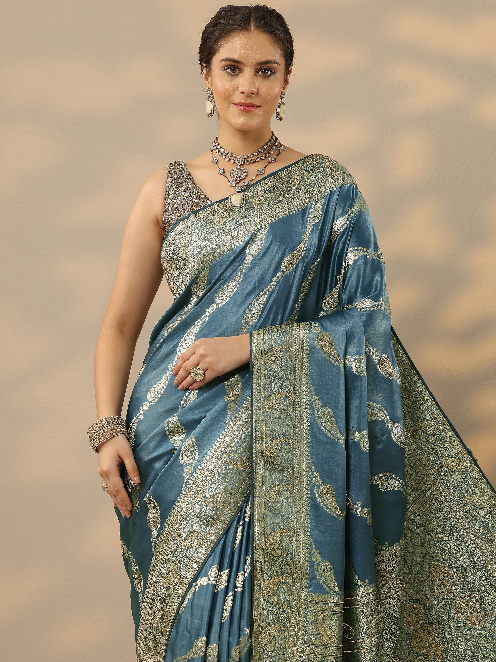Our Teal Printed Silk Blend Saree Features Captivating Intricate Paisley Print. Complemented With An Unstitched Blouse Piece. This Charming Saree Is Perfect For Festive Occasions