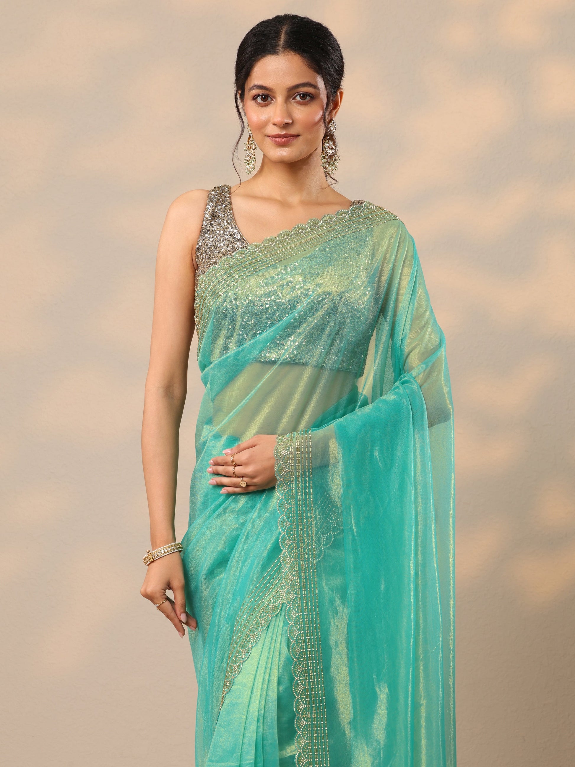 Blue Embellished Nylon Sarees With Unstitched Blouse Piece