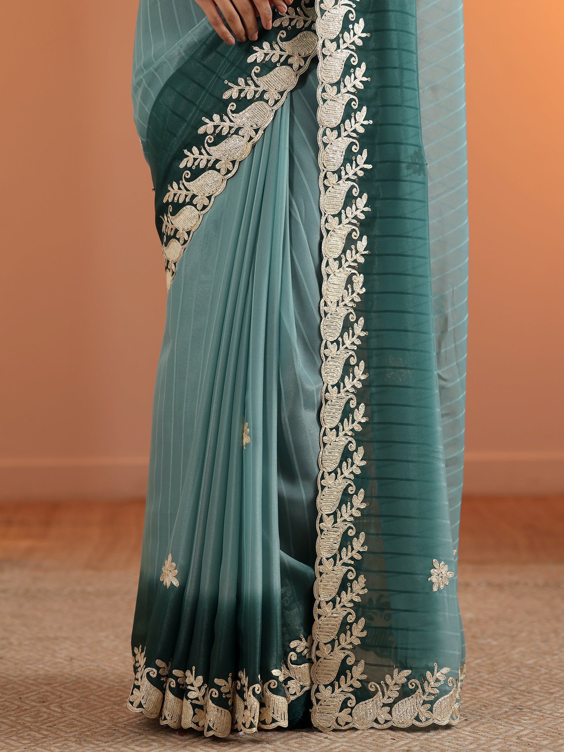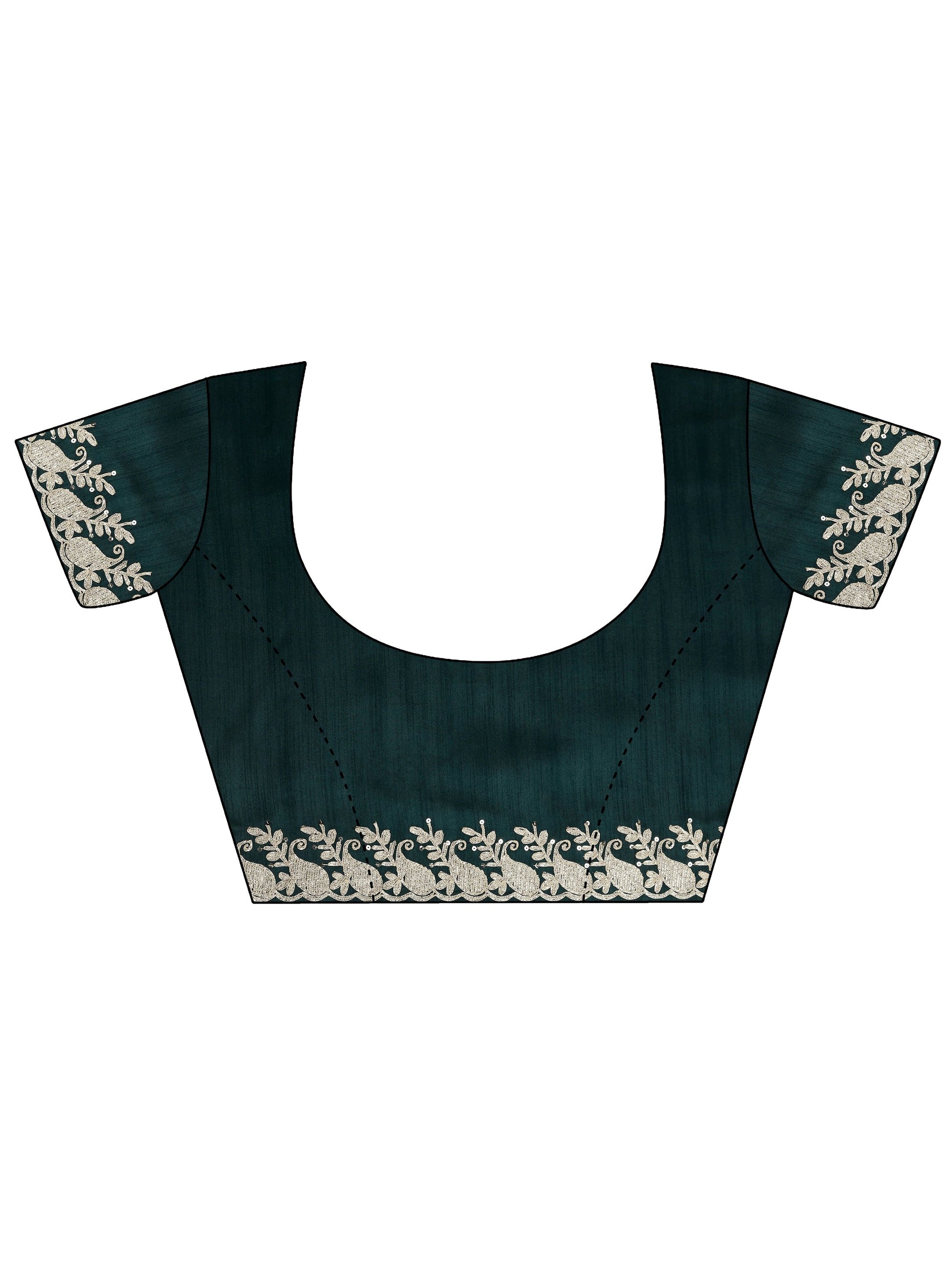 Our Teal Printed Silk Blend Saree Features Captivating Floral Embroidery. Complemented With A Unstitched Blouse Piece. This Charming Saree Is Perfect For Festive Wear