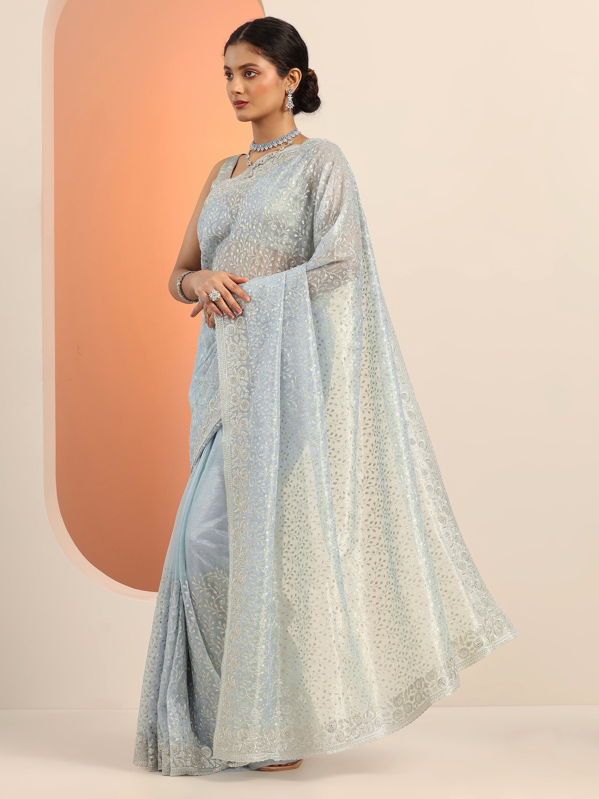 Blue Embroidered Nylon Saree With Unstitched Blouse Piece