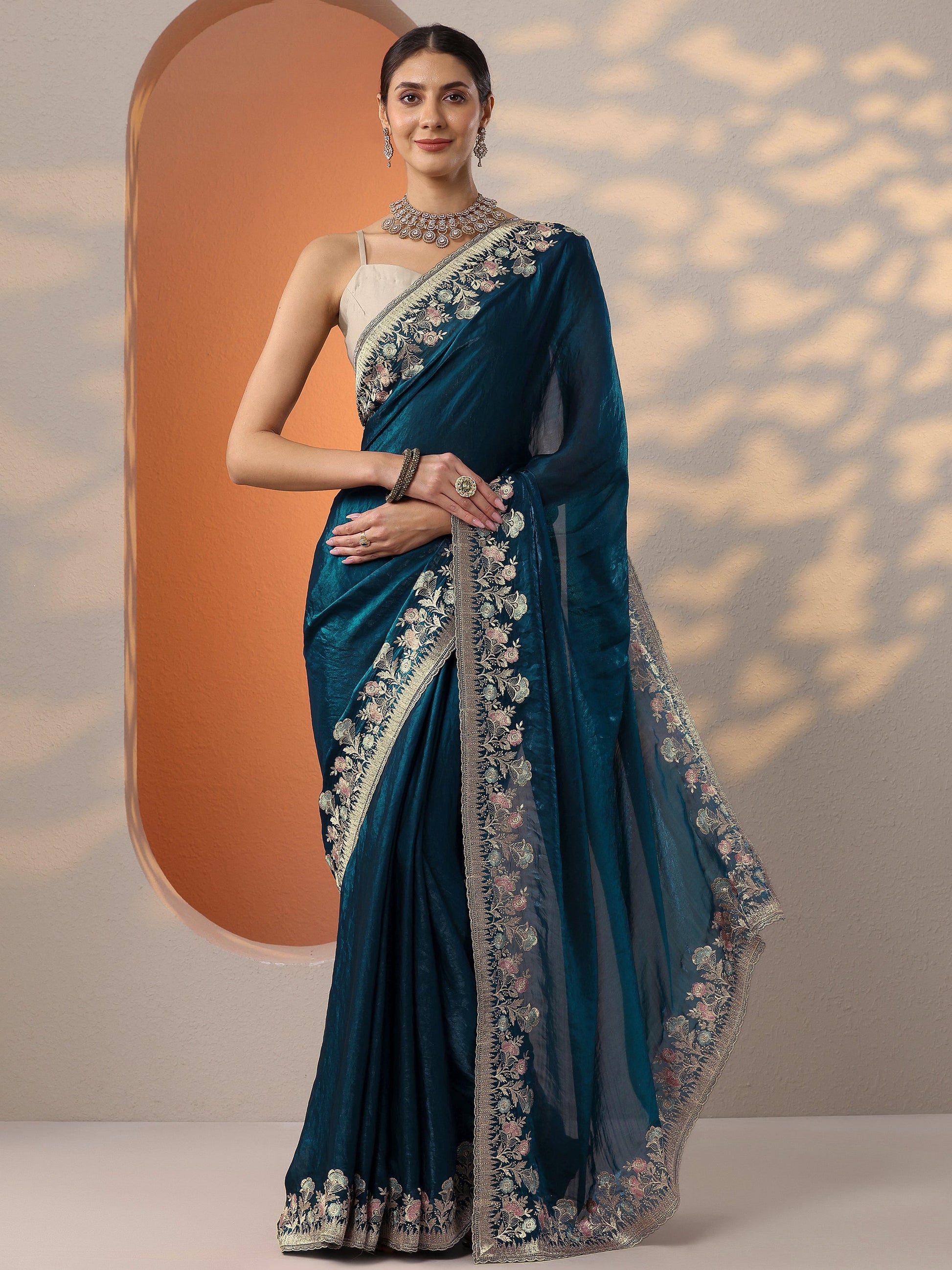Our blue embroidered organza saree features captivating floral embellishments. Complemented with a stitched blouse. This charming saree is perfect for festive occasions.