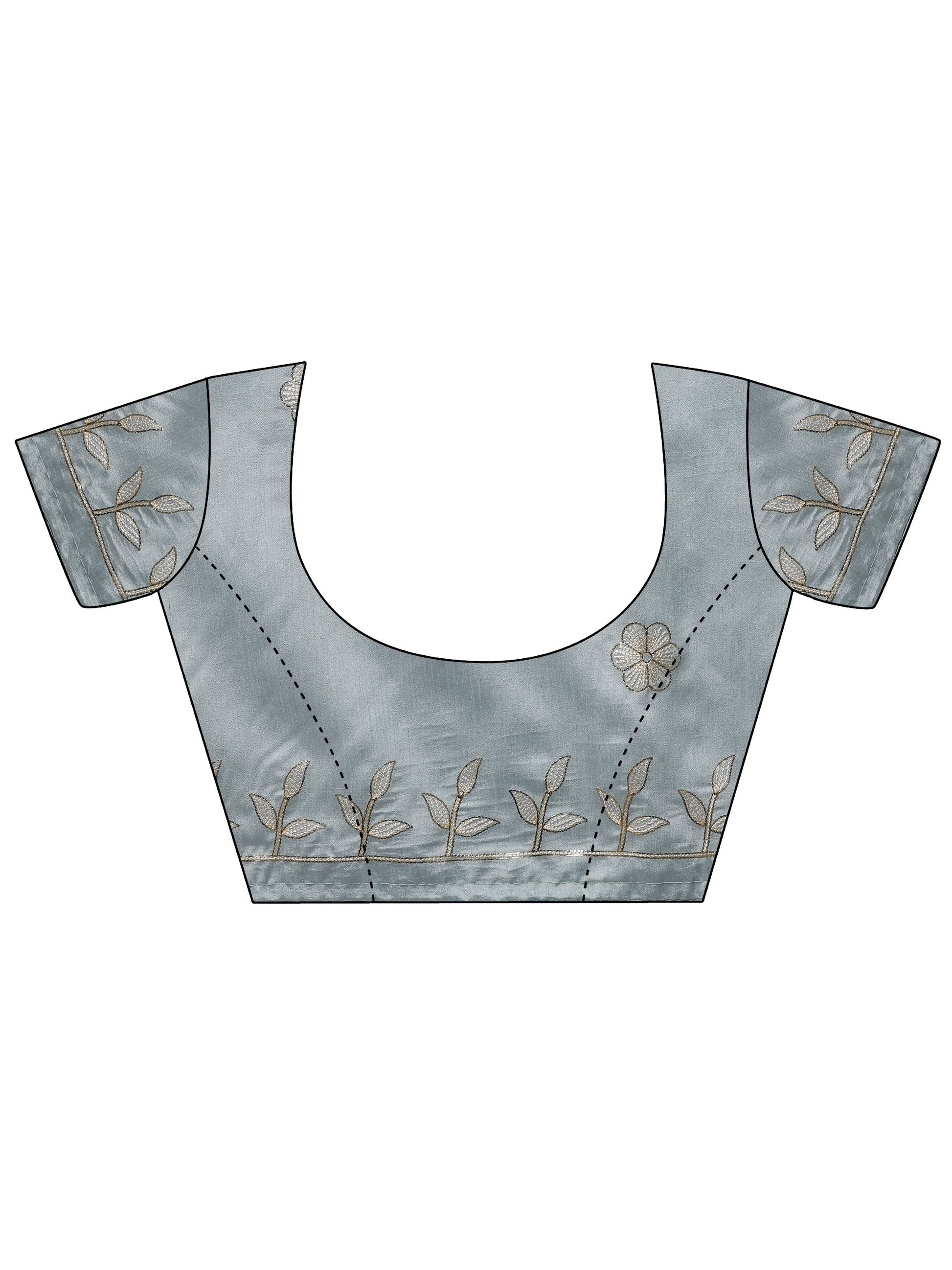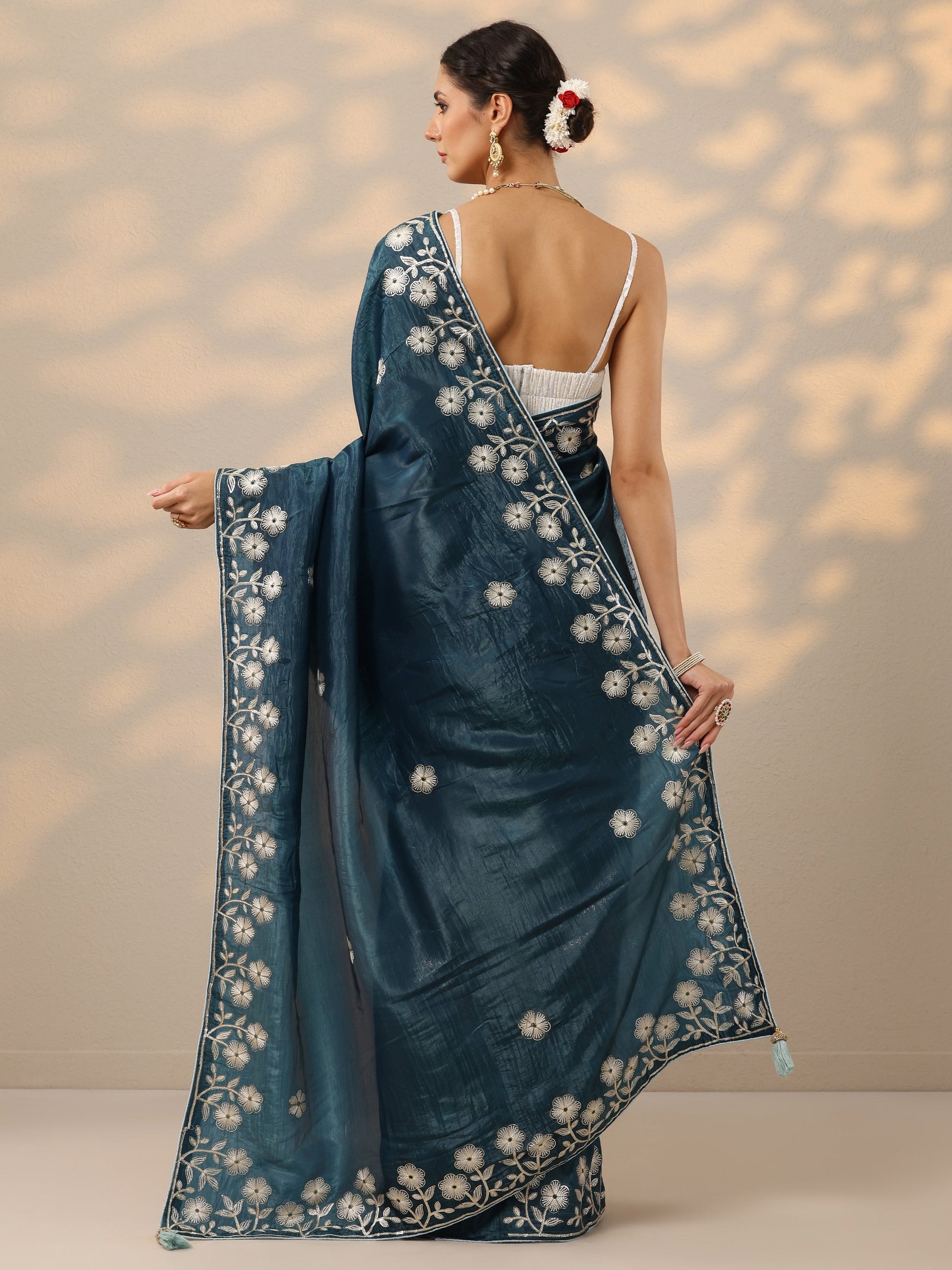 Our Teal Printed Organza Saree Features Captivating Floral Embroidery. Complemented With An Unstitched Blouse Piece. This Charming Saree Is Perfect For Festive Occasions