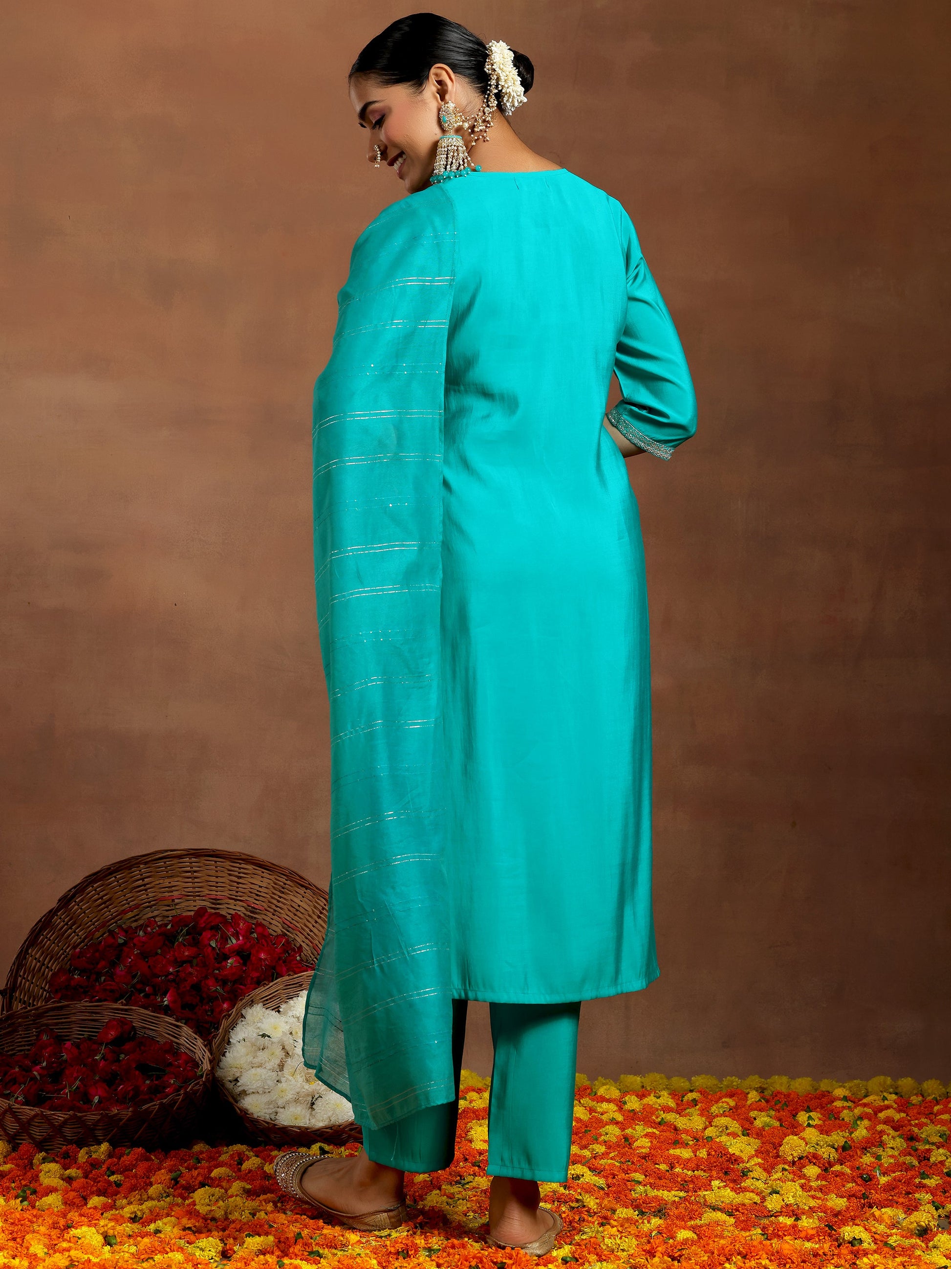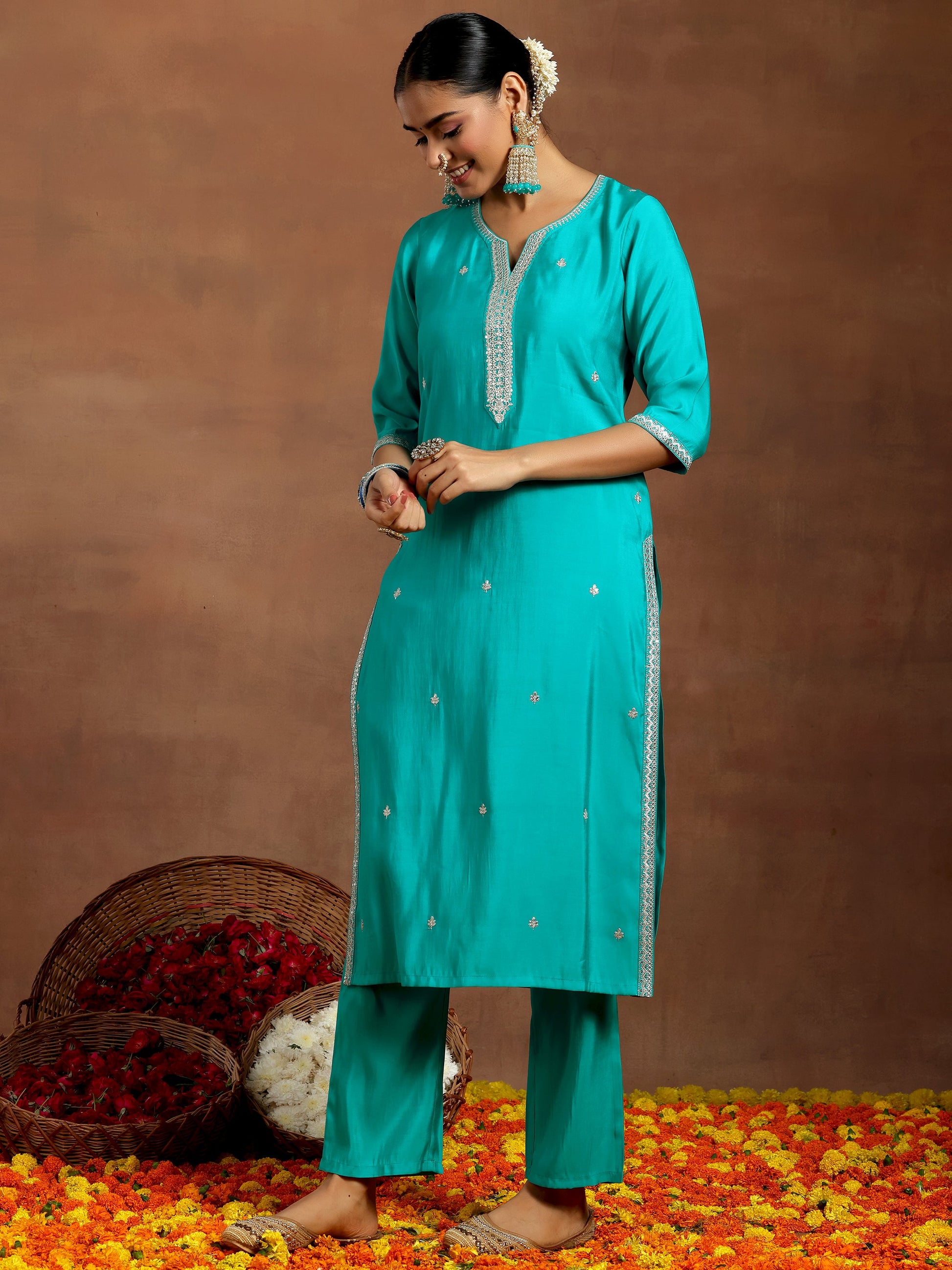 Our 3-piece teal silk blend kurta set features a straight-fit kurta with a V-neckline, regular sleeves, and statement yoke. Complemented with straight pants with an elasticated waistband and an embroidered dupatta. Adorned with embroidered accents, this style is perfect for casual occasions.