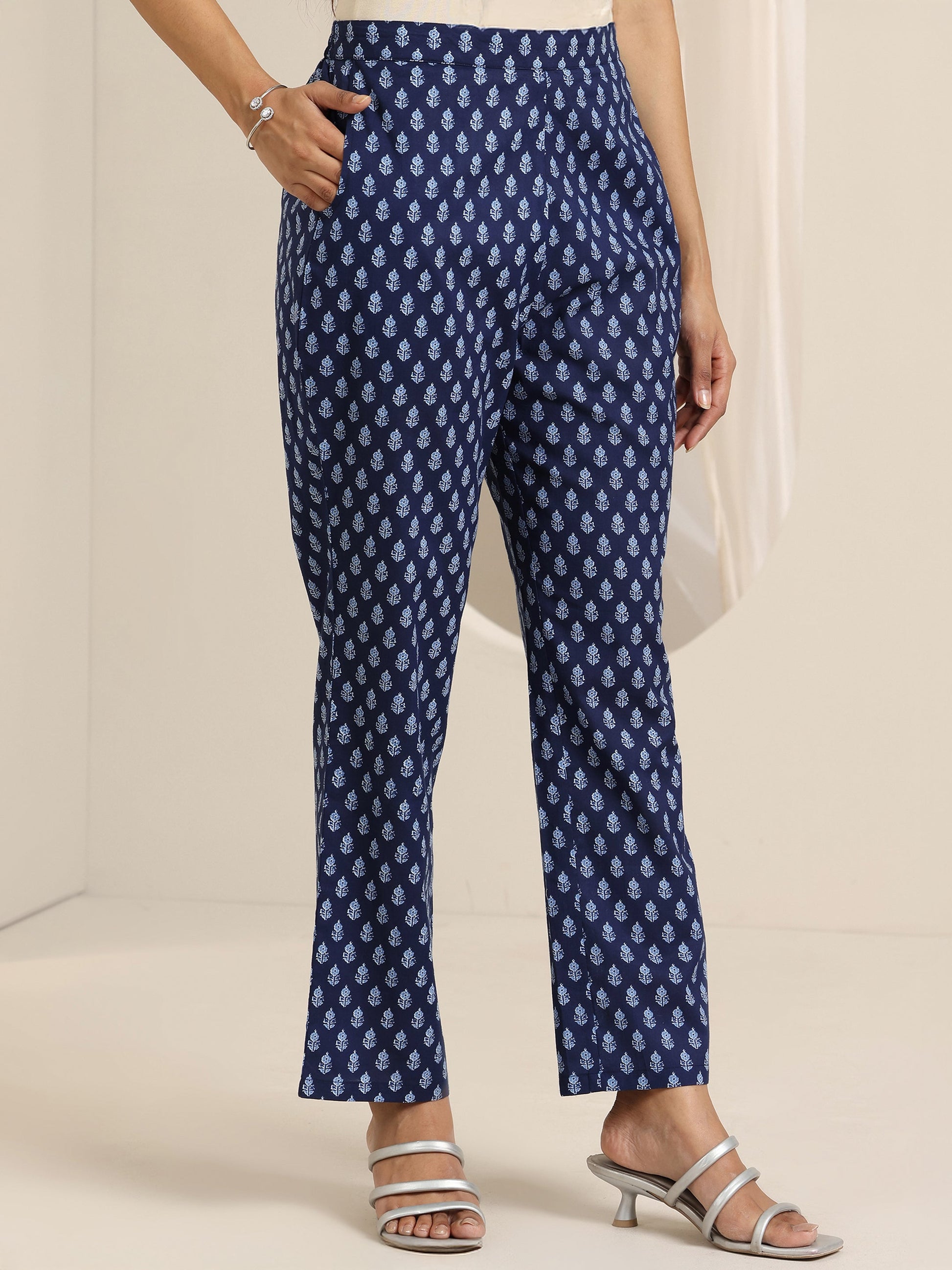Our 3-piece navy blue cotton kurta set features an A-line kurta with a square neckline, regular sleeves, and a statement yoke. Complemented with trouser with a partially elasticated waistband and a printed dupatta. Adorned with printed embellishments, this style is perfect for casual occasions.