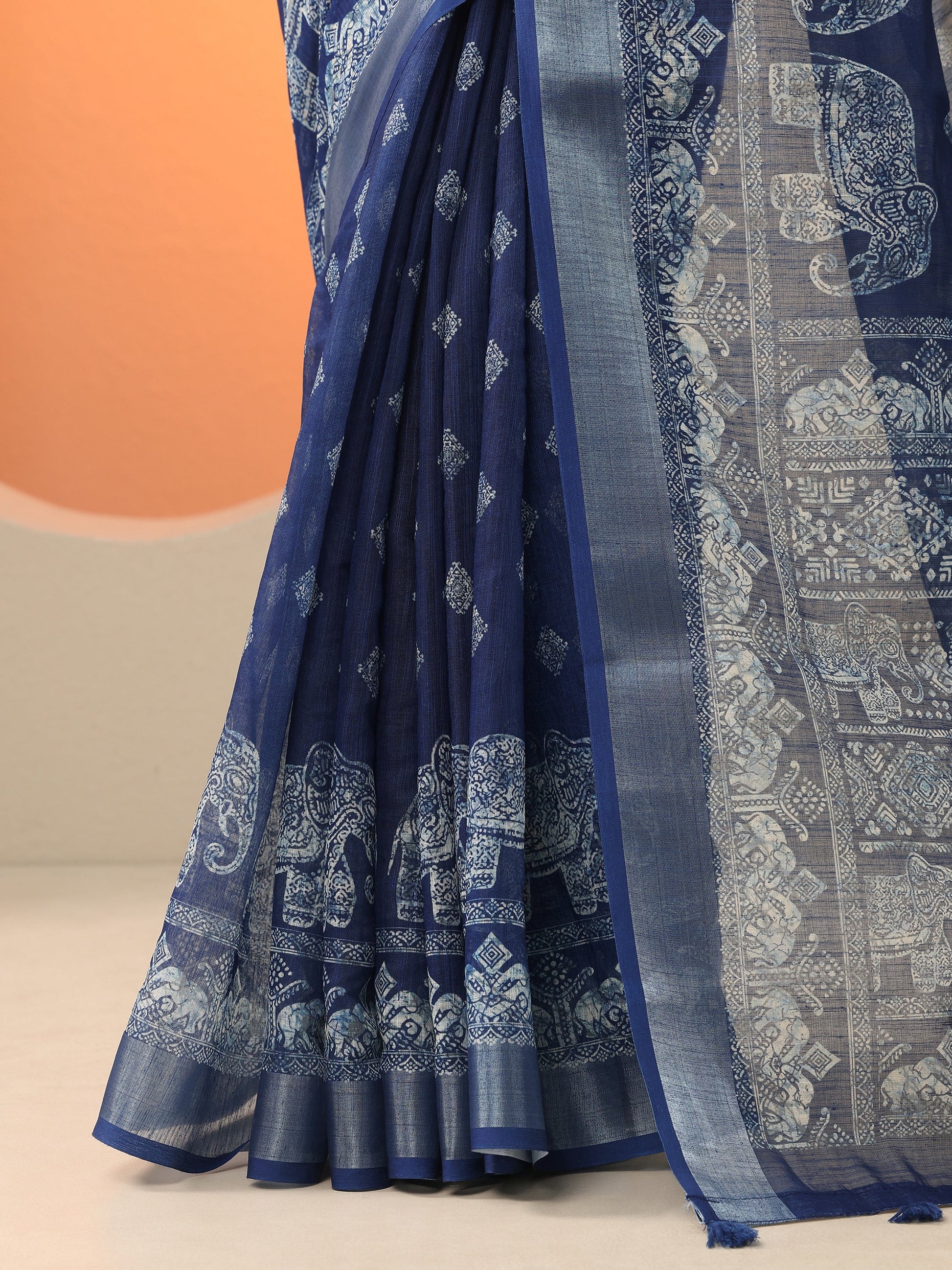 Our Navy Blue Printed Cotton Blend Saree Features Captivating Top Print. Complemented With An Unstitched Blouse Piece. This Charming Saree Is Perfect For Festive Wear.