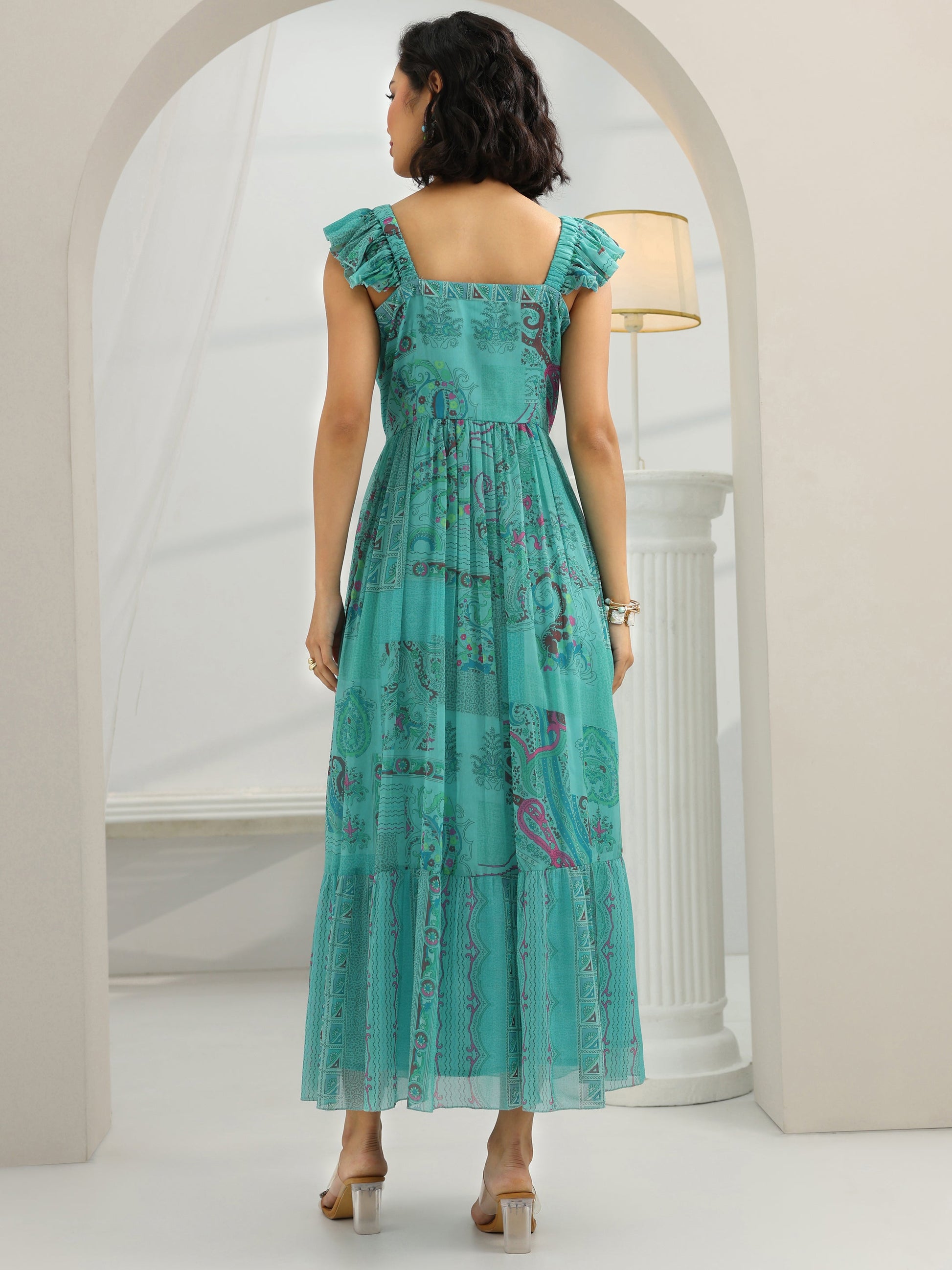 Blue Printed Chiffon Fit And Flare One Piece Dress