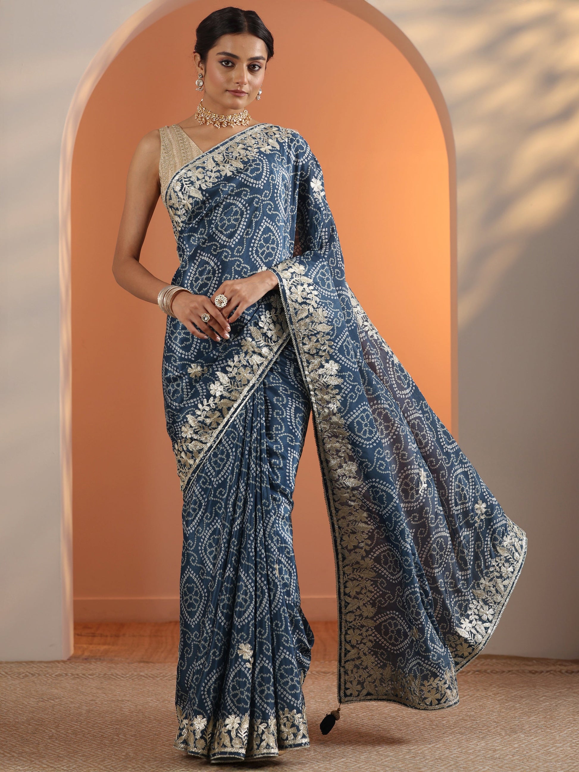 Blue Bandhani Printed Chinon Saree With Unstitched Blouse Piece