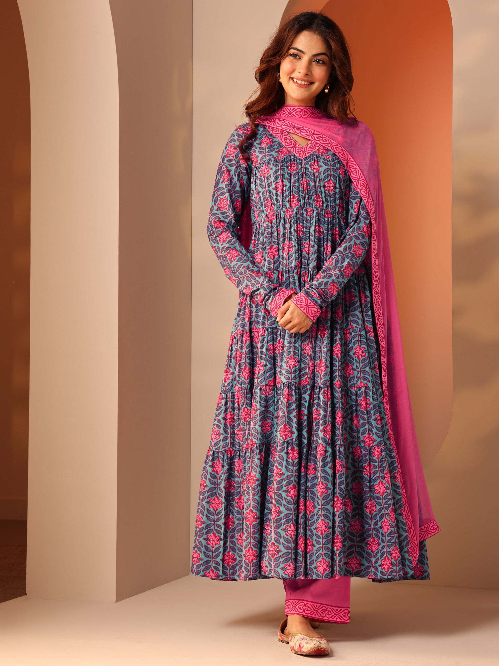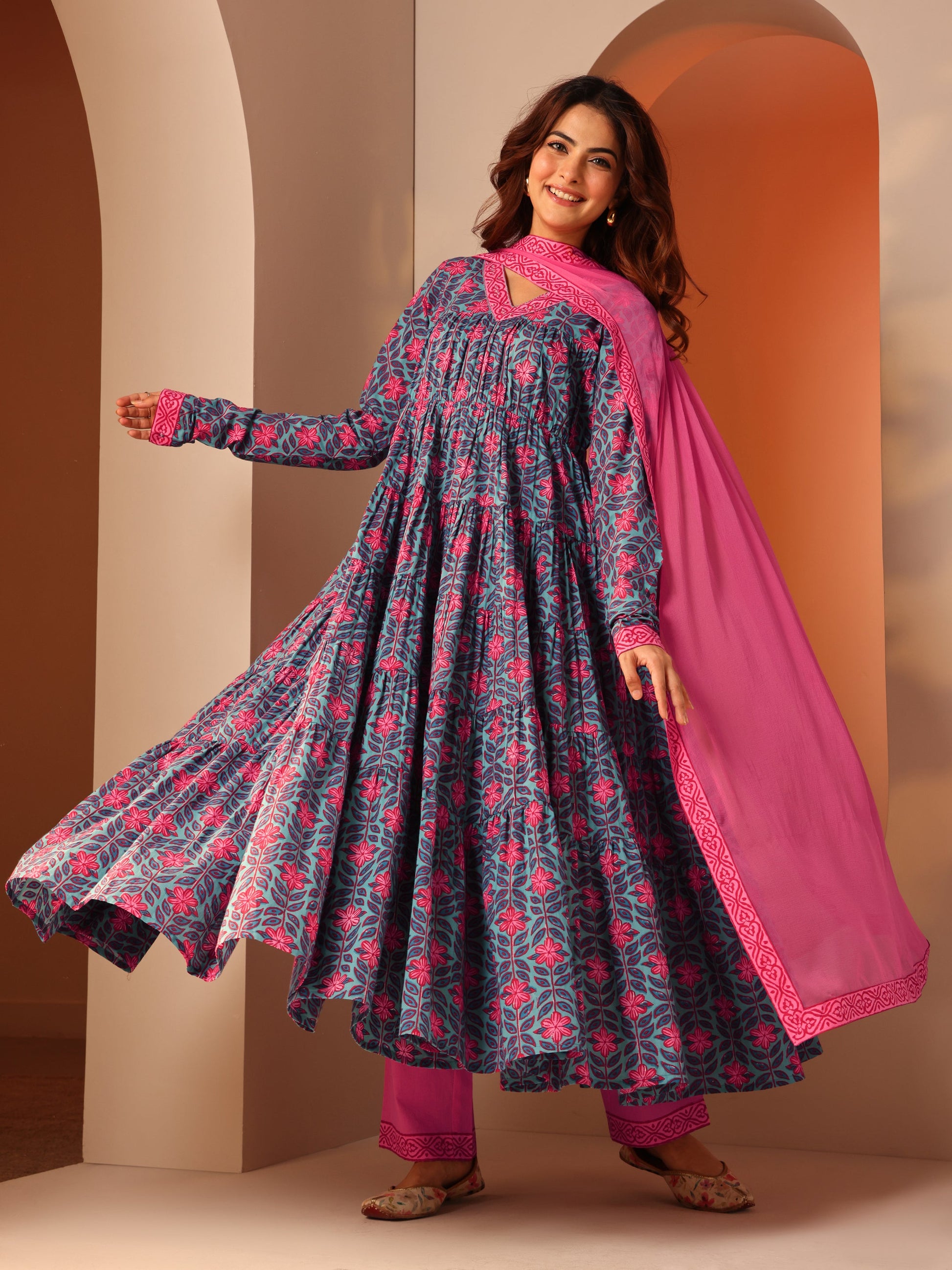 Blue Printed Cotton Anarkali Suit Set With Dupatta