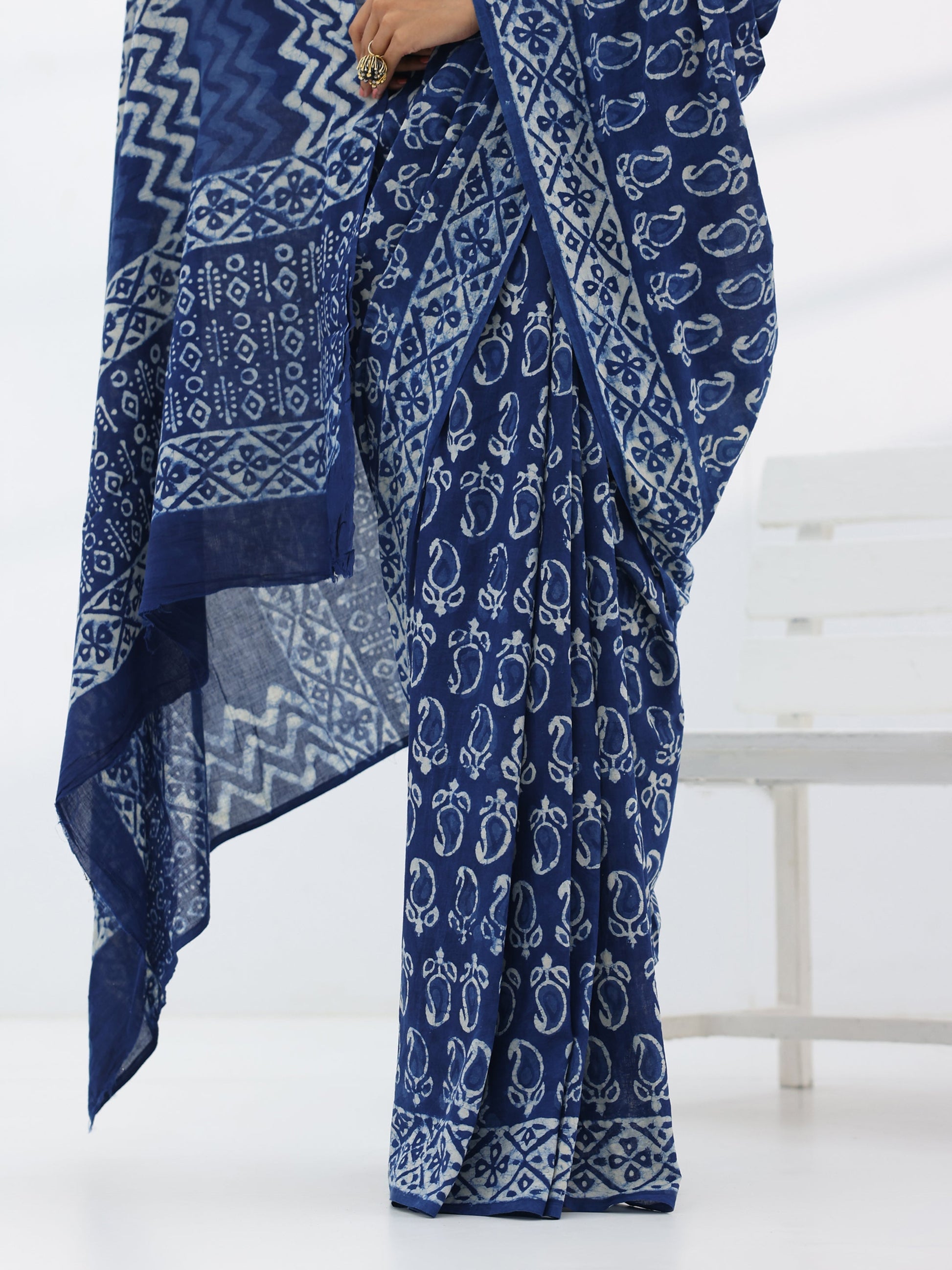 Blue Printed Cotton Saree With Unstitched Blouse Piece
